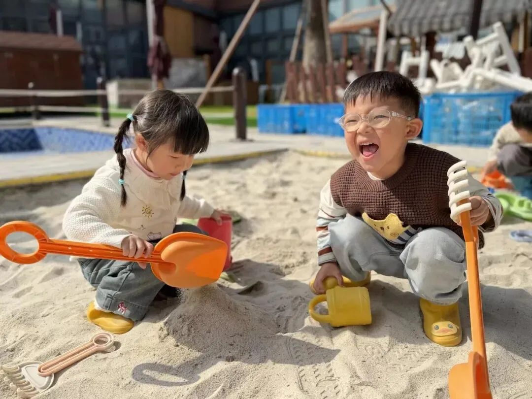 我和好朋友一起搭出了我们心中的幼儿园,有教室、操场、沙池和滑滑梯。