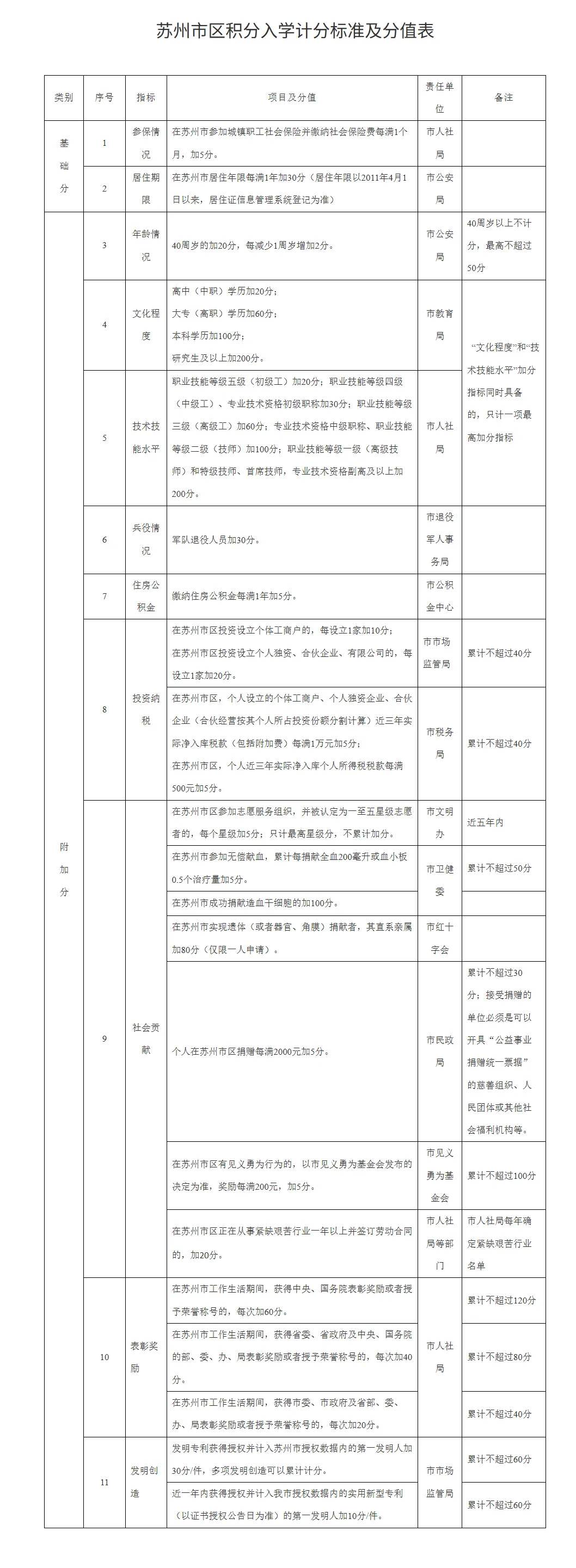 附加分:年龄情况、文化学历、技术技能水平、服兵役情况、缴纳住房公积金、投资纳税、社会贡献、表彰奖励、发明创造等赋分。