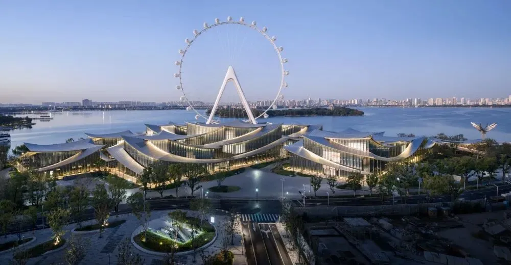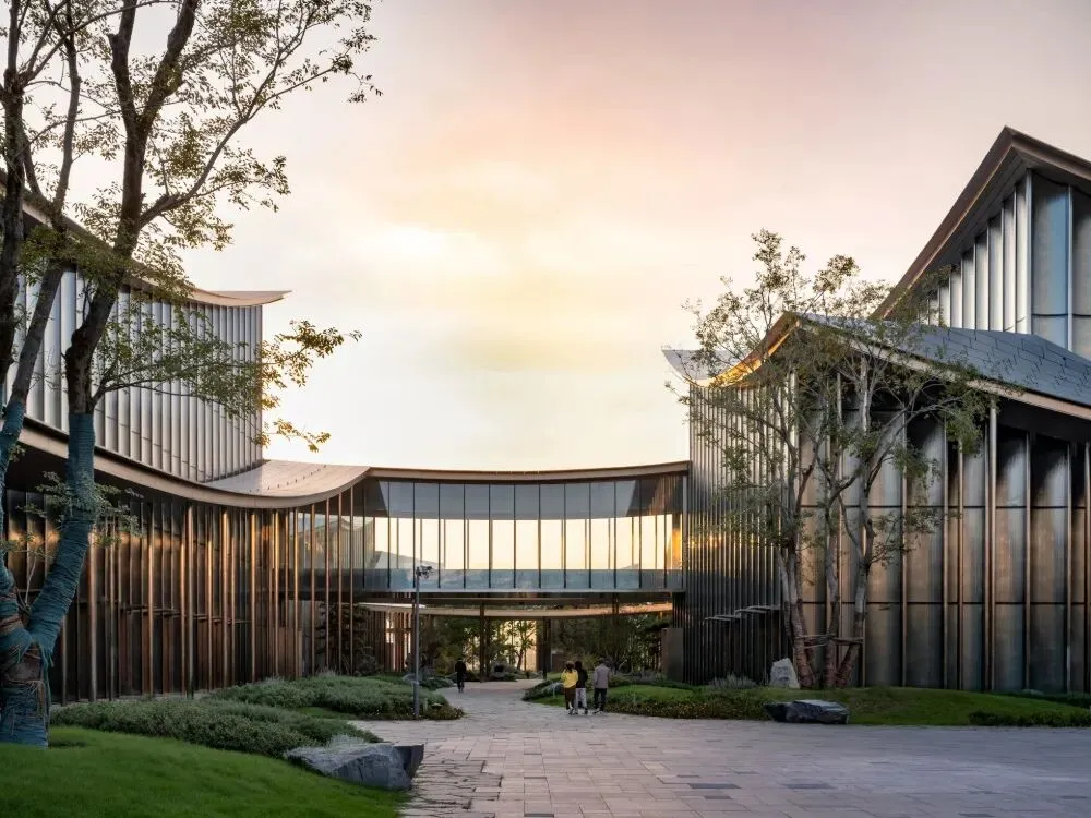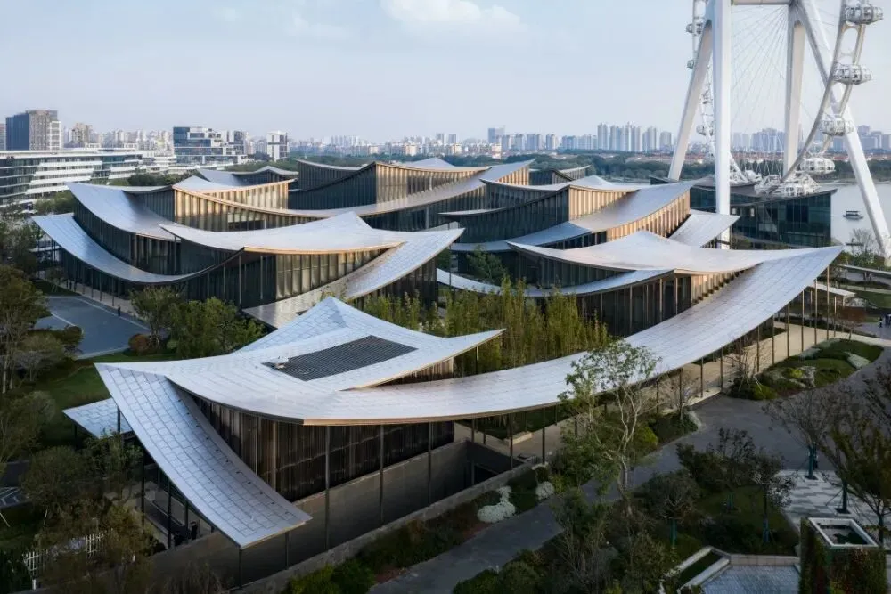 建筑群由9个独栋单体通过丝带状屋顶蜿蜒连接,立面采用弧形竖向玻璃与不锈钢材质,在光影与水波的映衬下,宛如金鸡湖畔一幅动态的艺术画卷。