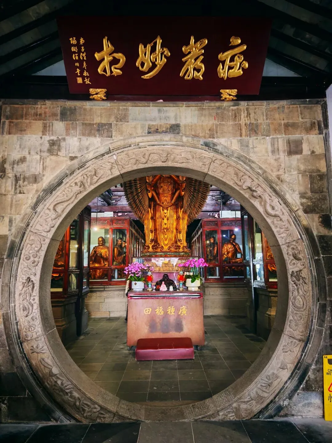 寺院以中轴线布局,依次为山门、天王殿、大雄宝殿等主体建筑,两侧廊庑对称严谨,体现出传统寺院的规整秩序。其中精华当属罗汉堂,始建于明代晚期,曾于清咸丰十年(1860年)毁于战火,现存建筑与塑像为清末民初重建之作,被誉为中国“四大古罗汉堂”之一。其入口处石拱门圆框雕工精美,为明代遗物。堂内供奉五百罗汉塑像,姿态各异、神情灵动,静观之,仿若步入一片生动而超然的神佛世界。