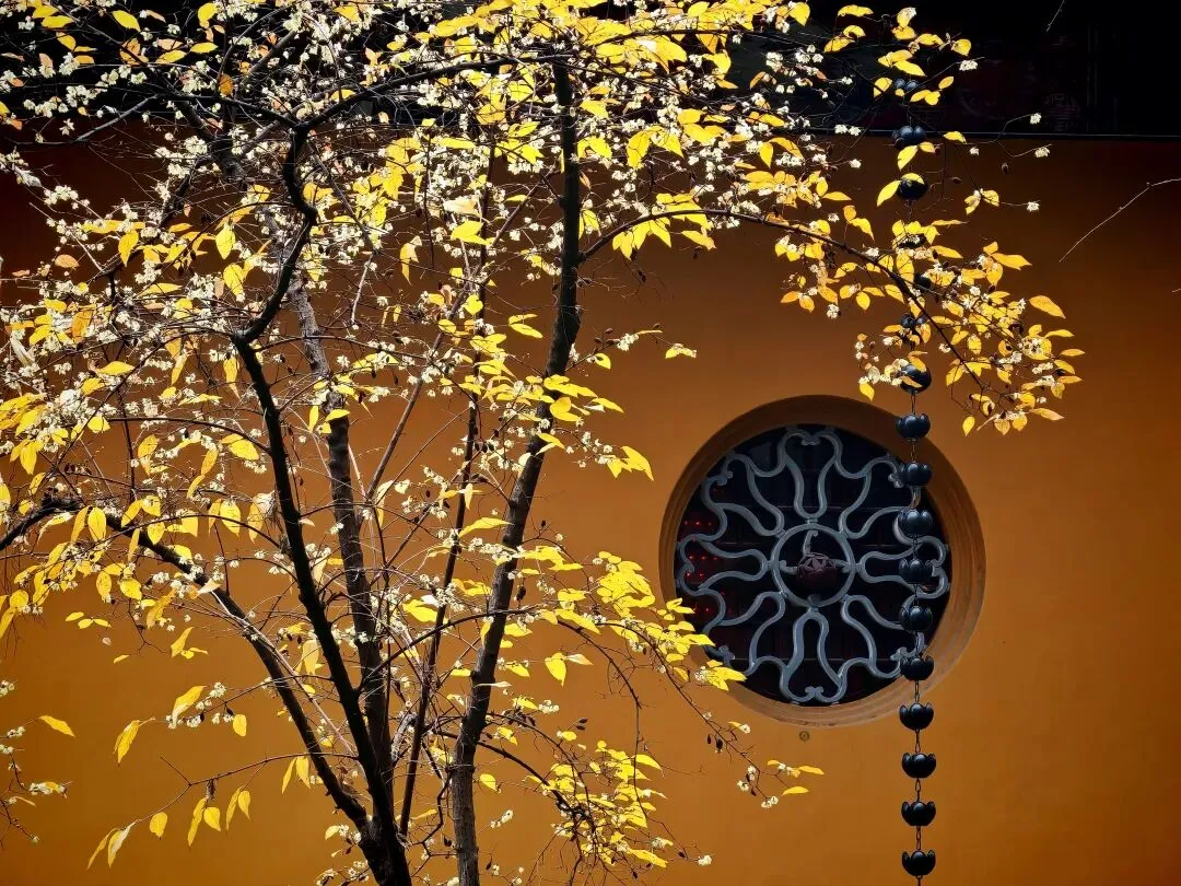 正值冬日,大雄宝殿后的数株腊梅凌寒绽放,鹅黄色的花瓣映衬着寺院明黄的墙面,幽香暗浮,成为游人驻足流连的一景。