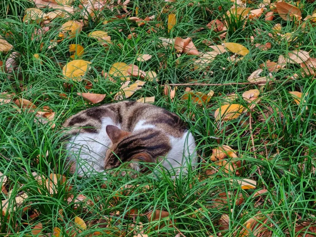 西园寺还有一道温馨的风景——寺中散养着不少猫咪。它们毛色各异,性情不一:有的慵懒卧于草丛酣睡,任人轻唤也酣然不动;有的活泼亲人,成了游客镜头下的“模特”;也有贪嘴的,安然享用人们递上的猫条。若您喜爱猫咪,不妨自带干净的猫粮前来互动;至于寺外兜售的饲料,品质难辨,还需留意。