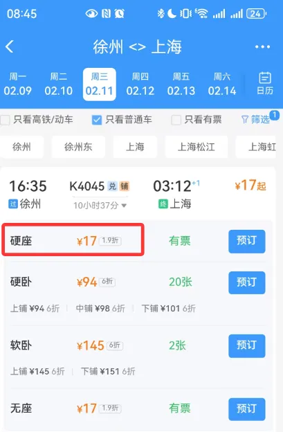 我看见徐州到上海的火车票,竟然打1.9折,只要17元,就能买到票!正常票价得在91左右呢!