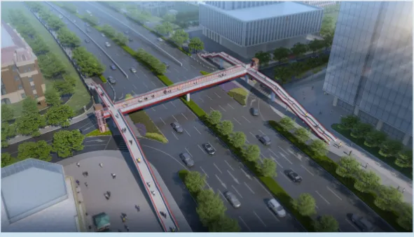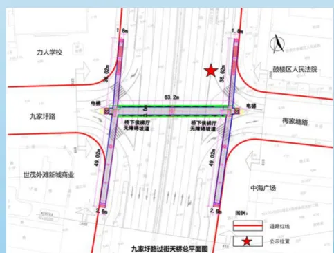 九家圩路过街天桥位于鼓楼区郑和中路和九家圩路交叉口。过街天桥呈“工”字型布置,全长约234米。其中东西向主桥长63.2米,南北向主桥及梯道长约171米,主桥桥下净高5米,主桥建筑高度约8.5米。北侧为步行专用梯道,南侧梯道兼顾自行车推行功能。在主桥东西两侧,各设1座无障碍电梯,电梯建筑高度约11.4米。