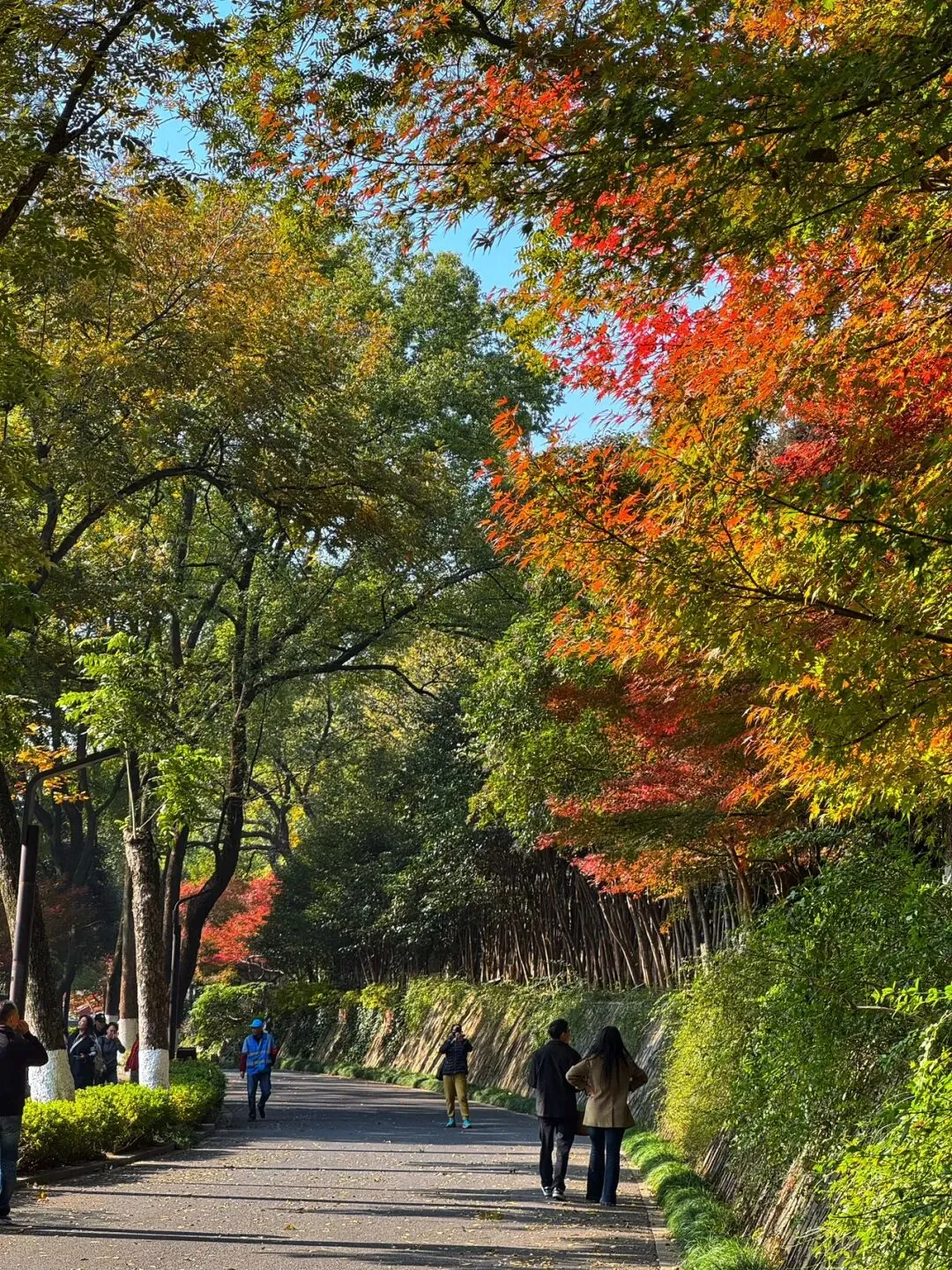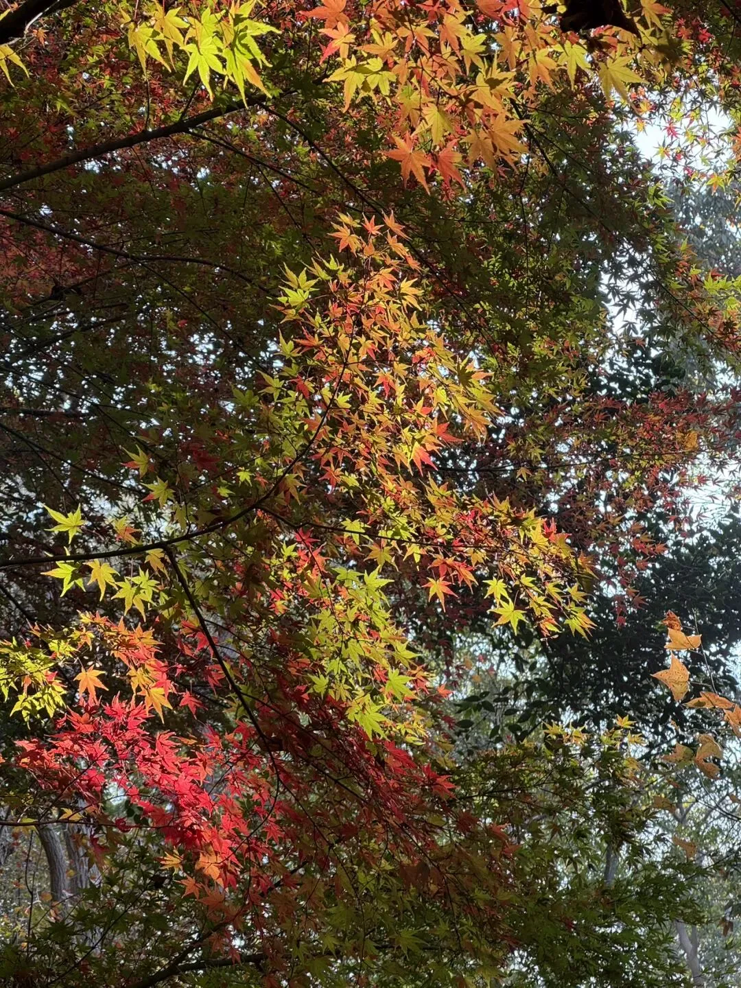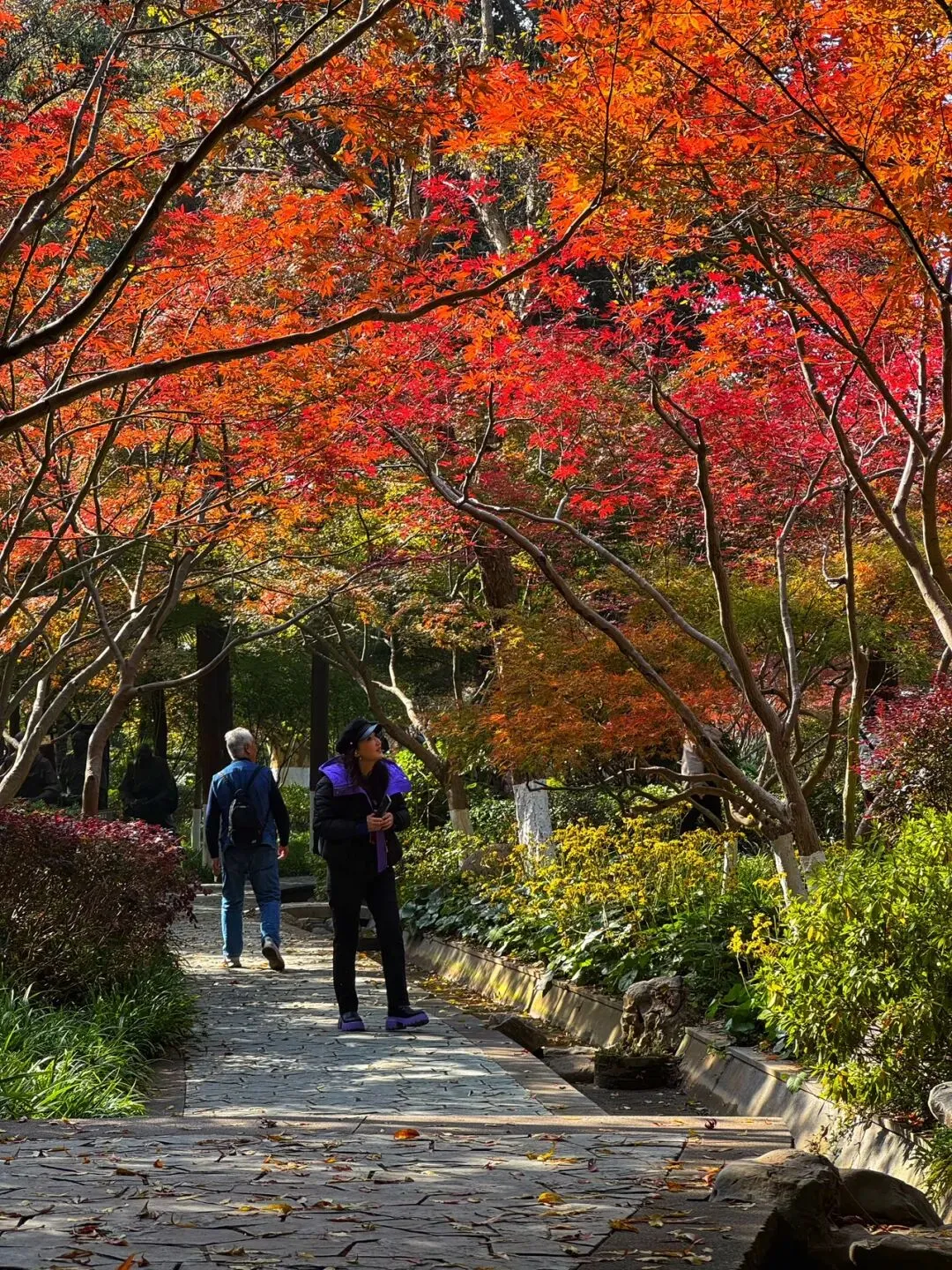 若说栖霞寺是历史的沉淀,那11月下旬的栖霞山,便是自然的狂欢。此时的枫叶正从浅黄渐次染成绯红,银杏抖落满树金箔,乌桕的叶子则像打翻了调色盘,紫红、橘黄、深褐层层叠叠,将整座山装扮成一幅浓墨重彩的油画。