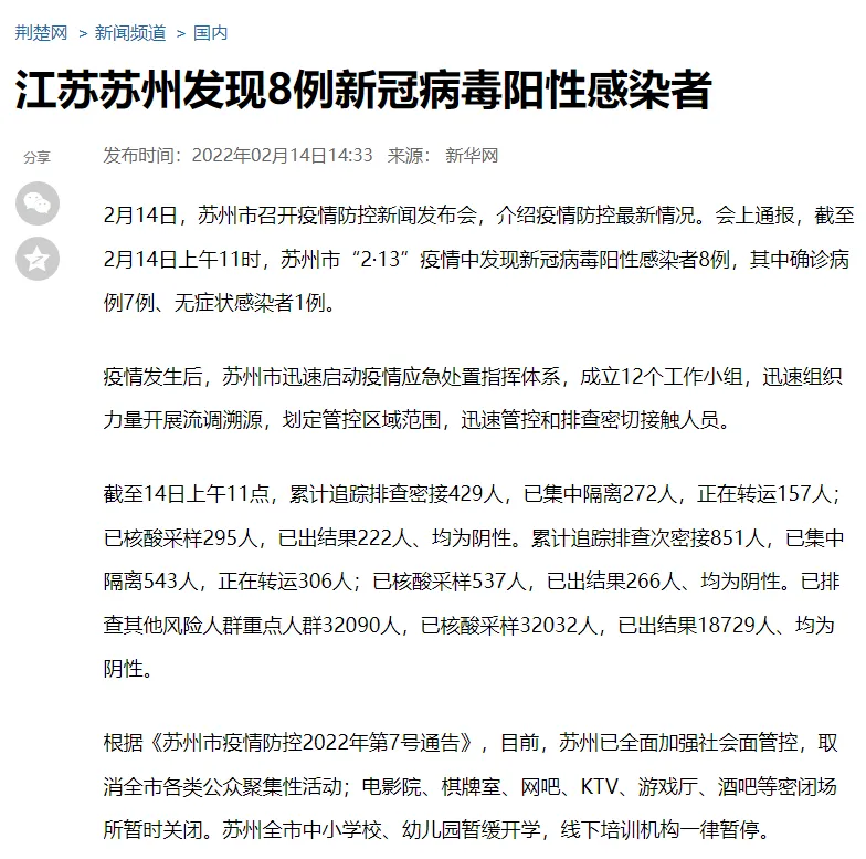 2月13日新闻爆出苏州又有新冠病毒的本地案例,到2月14日上午11时,总计8例。疫情总是那么突如其来的来。