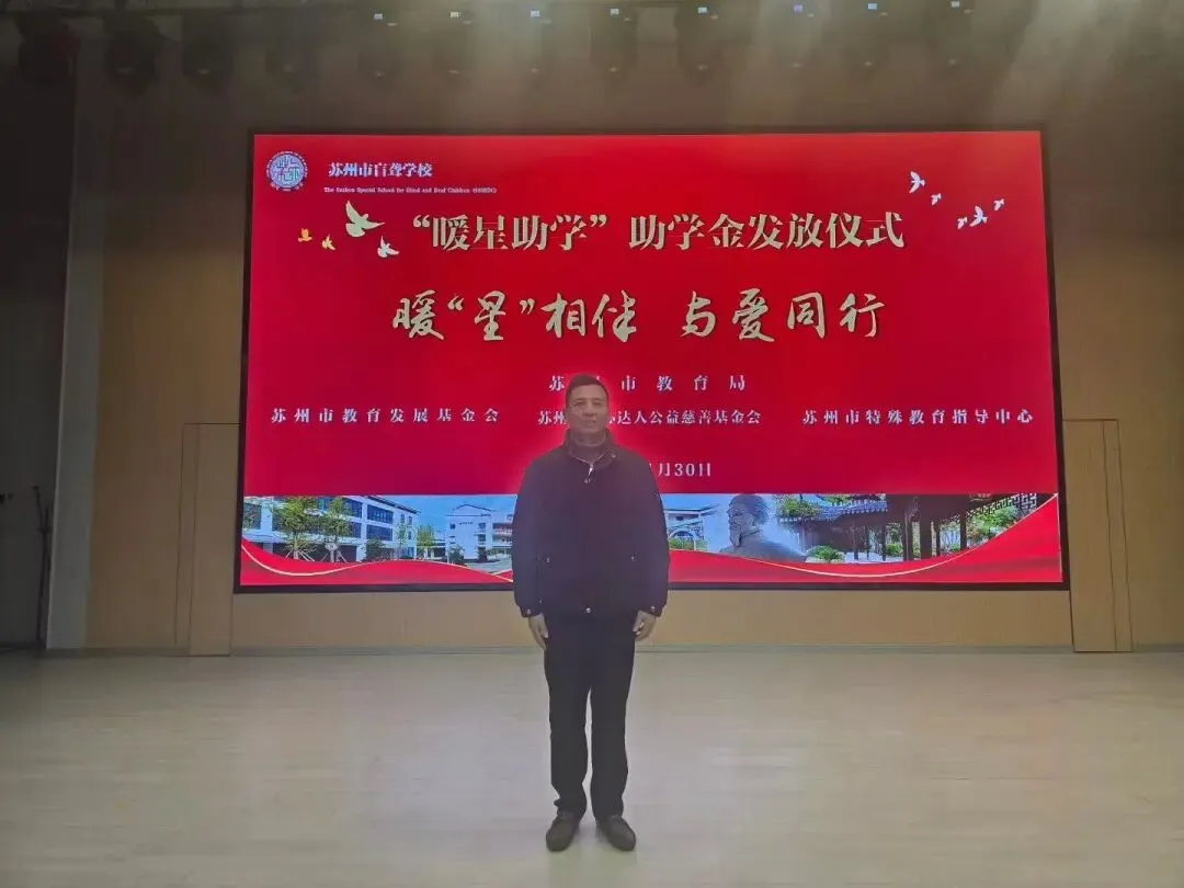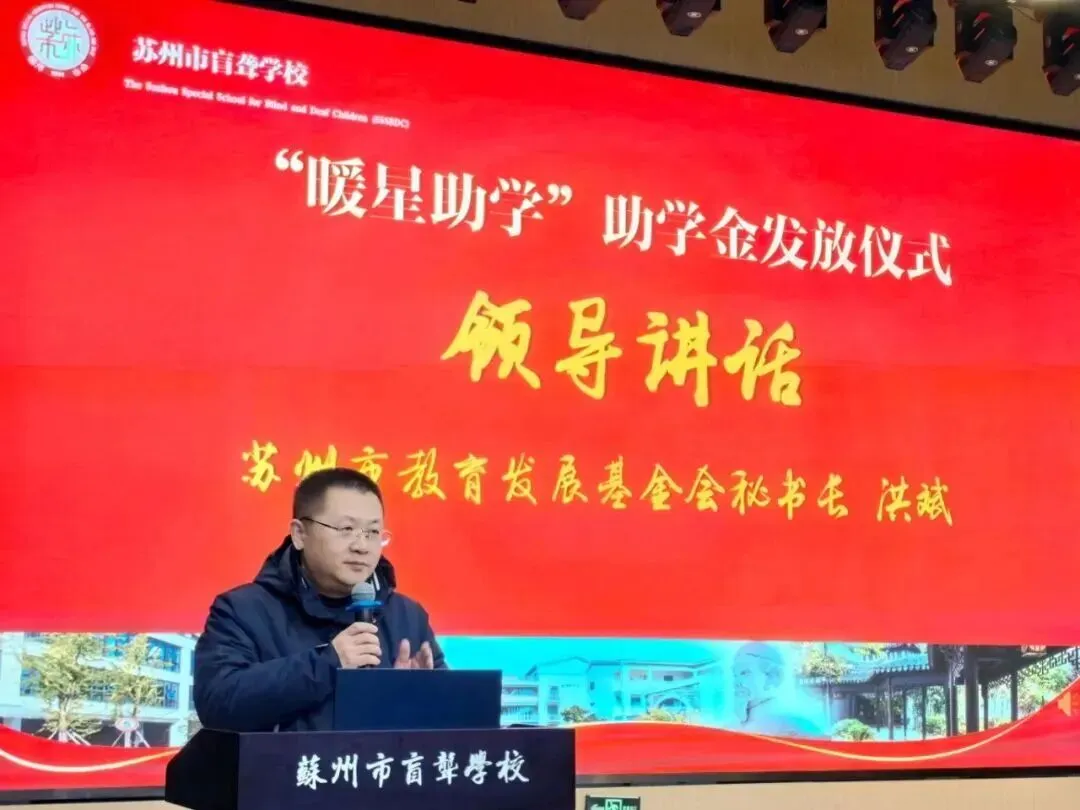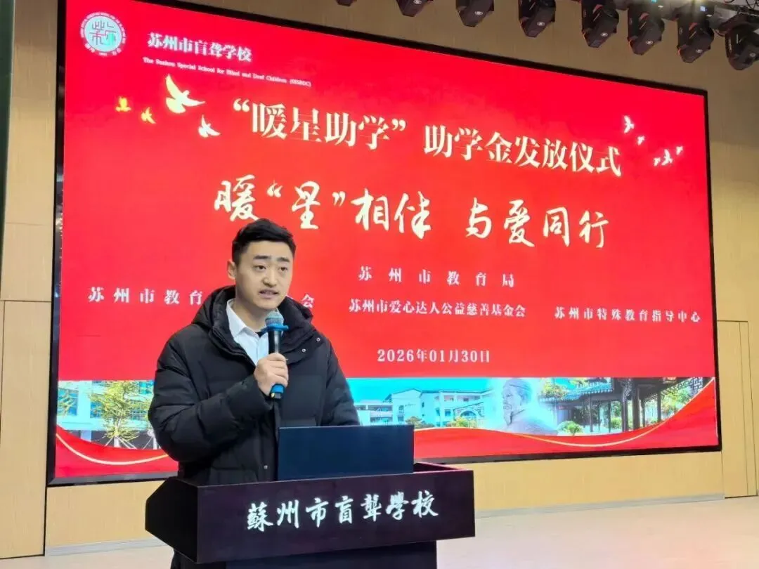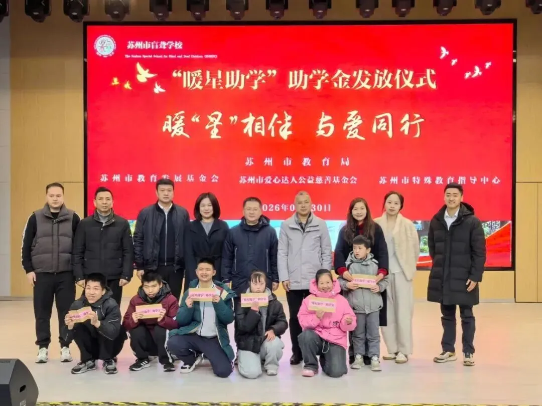 1月30日上午,在苏州市教育局、苏州市特殊教育指导中心的引领下,在苏州市爱心达人公益慈善基金会、苏州市泰兴商会的携手同行中,在六所特殊教育学校老师们如暖阳般的关怀里,苏州市教育发展基金会与苏州市爱心达人公益慈善基金会相聚于苏州市盲聋学校振音厅,共同开启了一场温馨且庄重的“暖星助学”助学金发放仪式,为特殊学子们送去爱与希望。