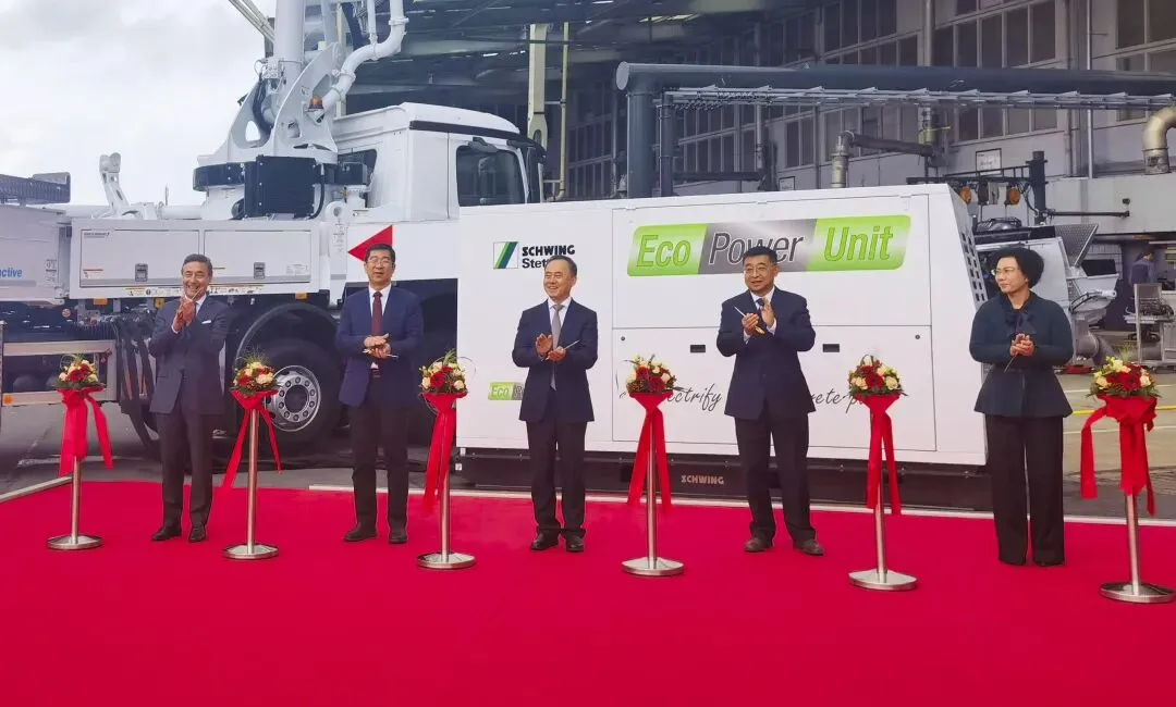 在德国施维英公司,宋乐伟一行为Eco混合动力新产品剪彩,并参观了臂架泵车总装车间,详细了解生产制造、技术创新和市场拓展情况。