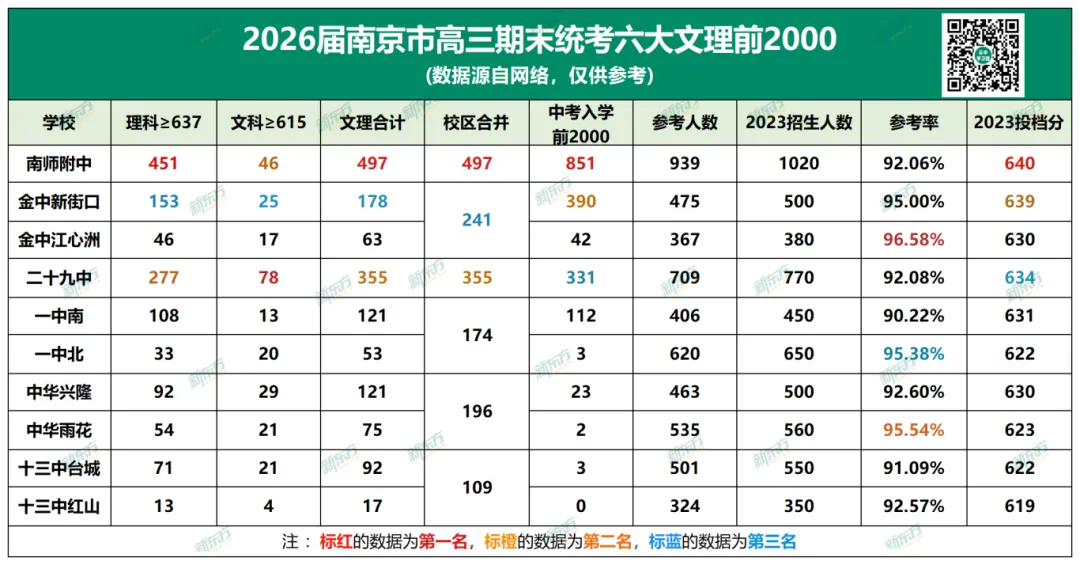 六大文理前2000(理科637分以上、文科615分以上)的数据也出炉了。结合参考人数和当年中考入学前2000的人数来看,二十九中、一中、中华和十三中的推进率还是很可观的。