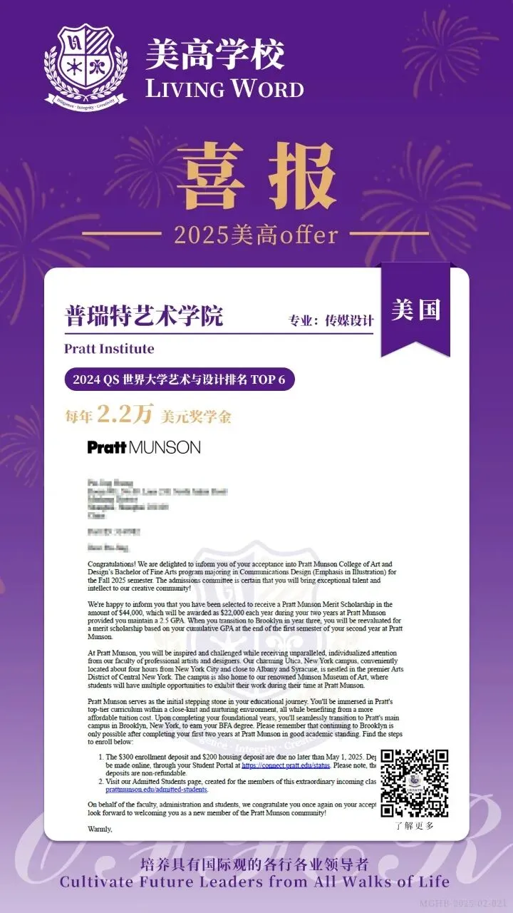 这些成就不仅展示了美高学子在艺术领域的卓越才能,也反映了美高学校在培养学生国际竞争力方面的成功。学子们将有机会在世界顶尖的艺术与设计学府深造,开启他们的艺术之旅。美高学校致力于培养具有国际视野的各行各业领导者,我们为这些优秀学子的成就感到无比骄傲,并期待他们未来在艺术领域取得更大的成就。