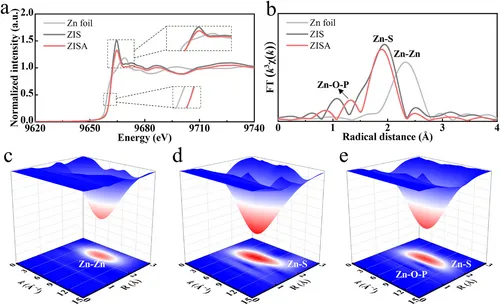 图2c-e:小波变换结果显示,ZISA的高R区域贡献减弱,反映表面缺陷被有效钝化,Zn配位环境更局域化。