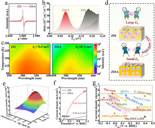 图3b:tDOS光谱显示,ZIS的深陷阱中心(0.18 eV)在ZISA中转变为浅态(0.07 eV),实现缺陷态重构;
