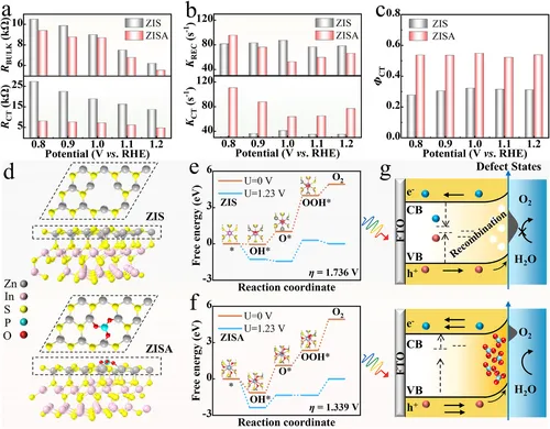 图4a-c:EIS分析显示ZISA的体相电阻(R_BULK)和界面电荷转移电阻(R_CT)更低,电荷转移速率常数(K_CT)最高,表面重组速率常数(K_REC)最低,电荷转移效率(Φ_CT)最优;