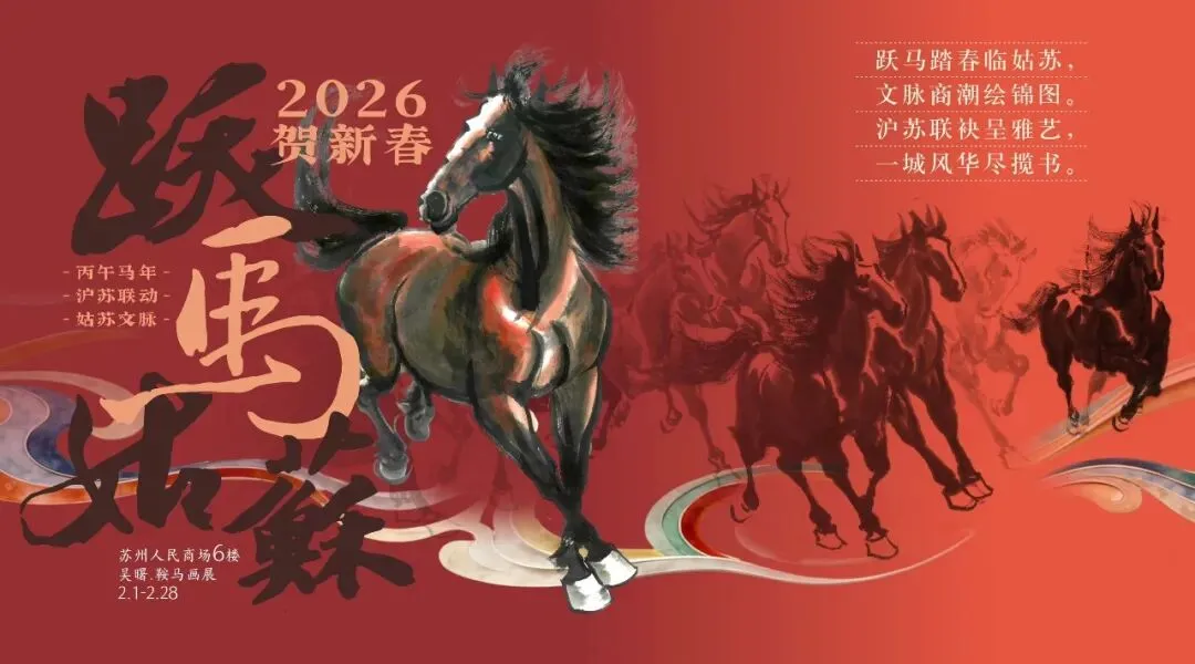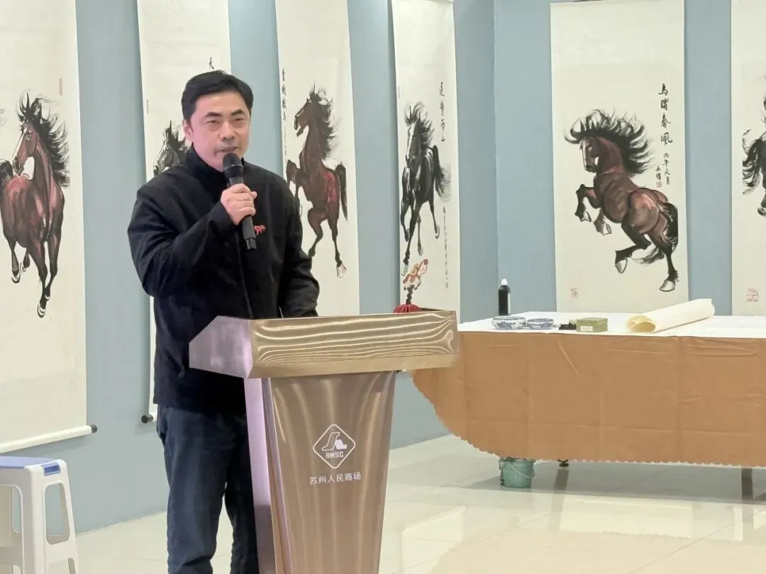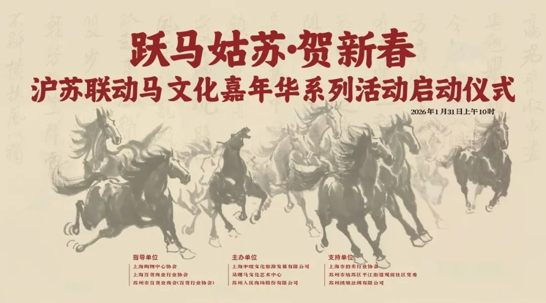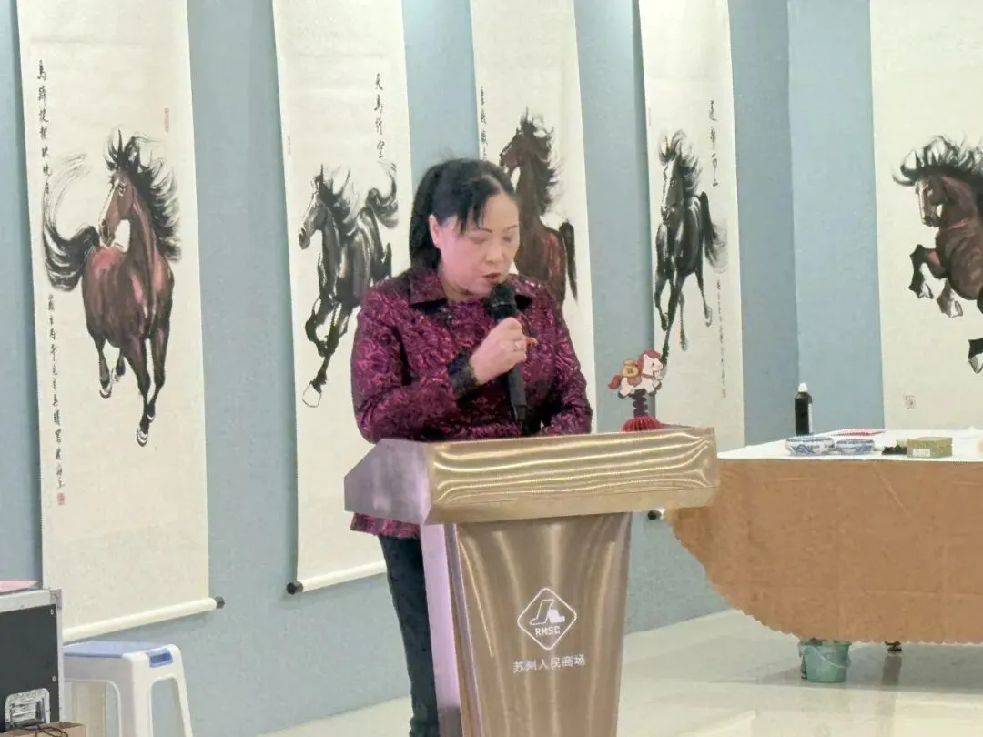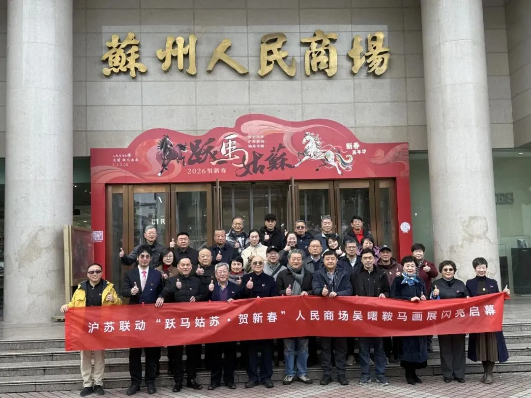 2026年1月31日上午,苏州人民商场六楼墨香飘逸、人声鼎沸。“跃马姑苏·贺新春”沪苏联动马文化嘉年华系列活动正式启幕。此次活动在上海购物中心协会、上海百货商业行业协会和苏州市百货业商会的指导下,在上海市拍卖行业协会、苏州市姑苏区平江街道观前社区党委和苏州绣娘丝绸有限公司的支持下,由上海申暄文化旅游发展有限公司、吴曙马文化艺术中心和苏州人民商场联合主办。沪苏两地文化大伽欢聚一堂,喜迎马年新春,这不仅是92年老商场的首次马年主题画展,更是一场融合艺术、商业与非遗的春节文化盛宴。