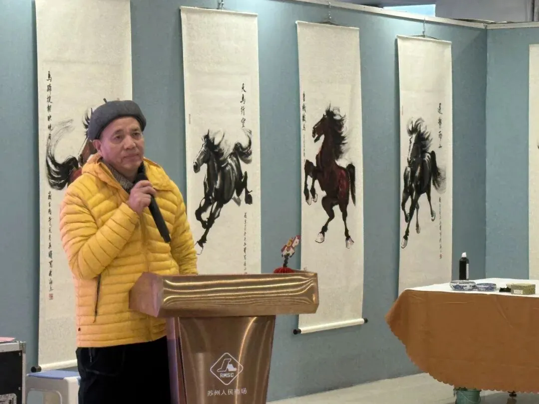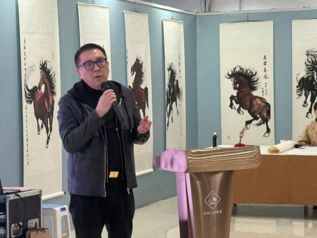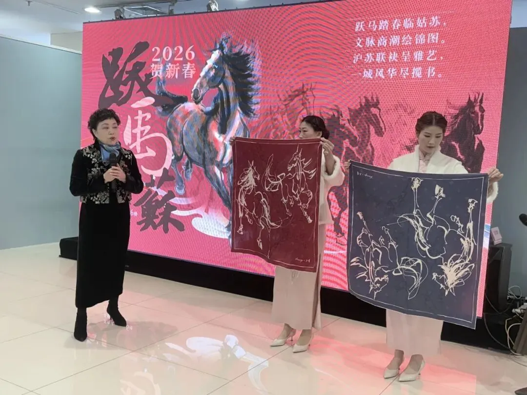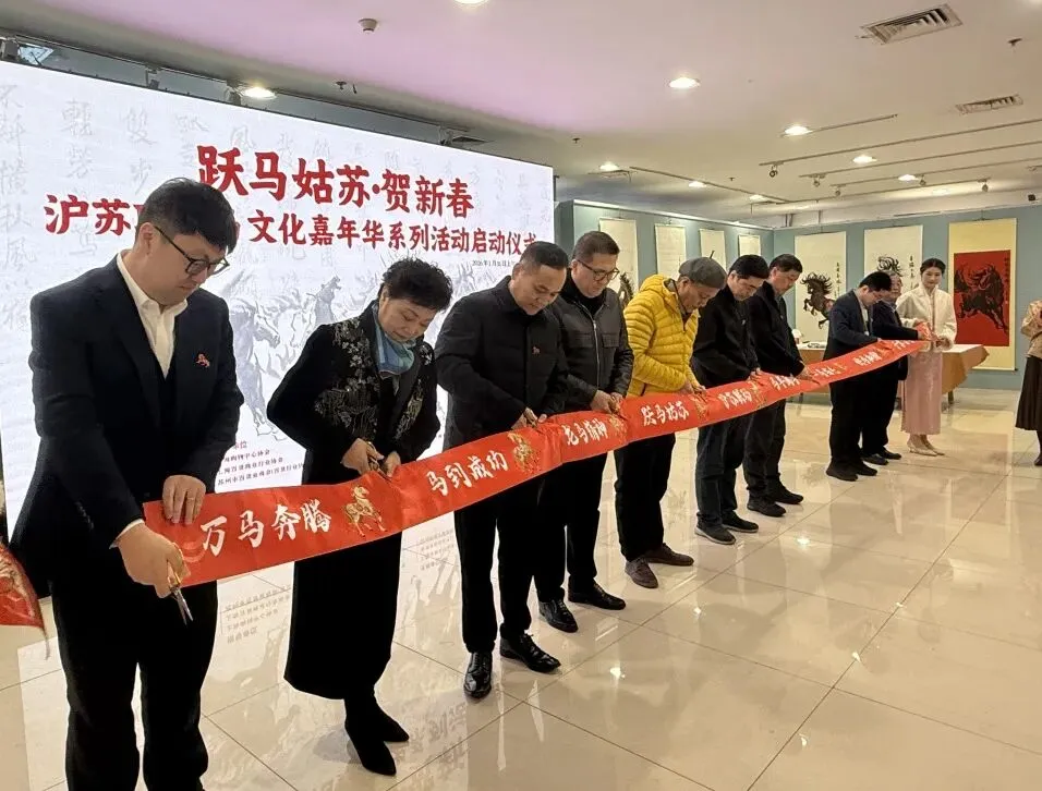 2026年1月31日上午,苏州人民商场六楼墨香飘逸、人声鼎沸。“跃马姑苏·贺新春”沪苏联动马文化嘉年华系列活动正式启幕。此次活动在上海购物中心协会、上海百货商业行业协会和苏州市百货业商会的指导下,在上海市拍卖行业协会、苏州市姑苏区平江街道观前社区党委和苏州绣娘丝绸有限公司的支持下,由上海申暄文化旅游发展有限公司、吴曙马文化艺术中心和苏州人民商场联合主办。沪苏两地文化大伽欢聚一堂,喜迎马年新春,这不仅是92年老商场的首次马年主题画展,更是一场融合艺术、商业与非遗的春节文化盛宴。