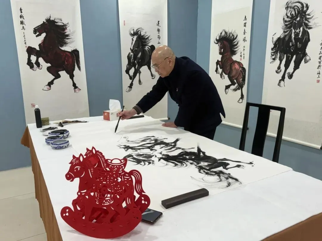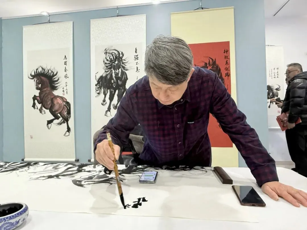 “看那匹马,仿佛要从纸上奔腾而出!”人群中传来阵阵赞叹。艺术创作现场成为活动的一大亮点,吴曙老师即兴创作奔腾骏马,每一笔都凝聚着深厚的艺术功底,现场观众亲眼见证一幅佳作从无到有的诞生过程,无不为之震撼,拍手称绝。