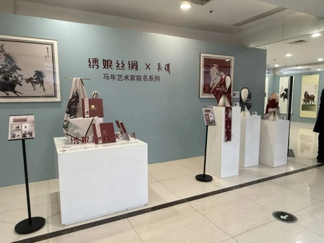 绣娘丝绸是人民商场的战略合作伙伴,此次通过沪苏两地行业协会牵手吴曙马文化艺术中心,开启了三方携手,文商融合的商业新模式。为配合本次活动开展,绣娘丝绸对人民商场内的专厅进行了美陈优化,在展位同步展出以马为主题的丝绸新品和文创用品,绣娘丝绸与吴曙老师联名创作的新品首次亮相就艳惊四座。