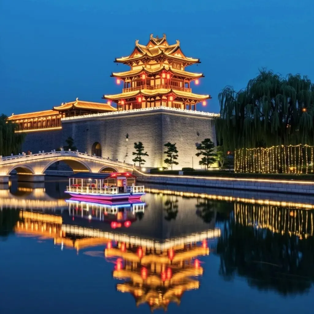 苏州阊门夜景,灯笼高挂,护城河倒影,古建筑与现代灯光交融