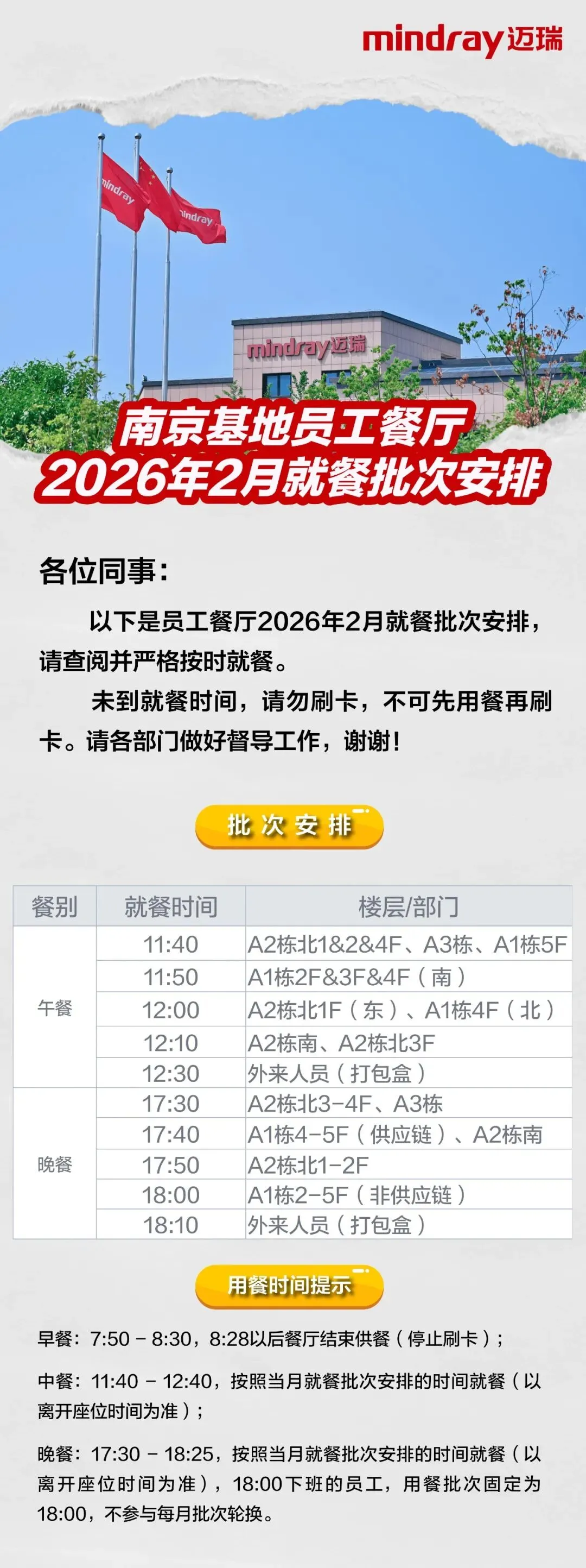 >南京基地员工餐厅2026年2月就餐批次安排