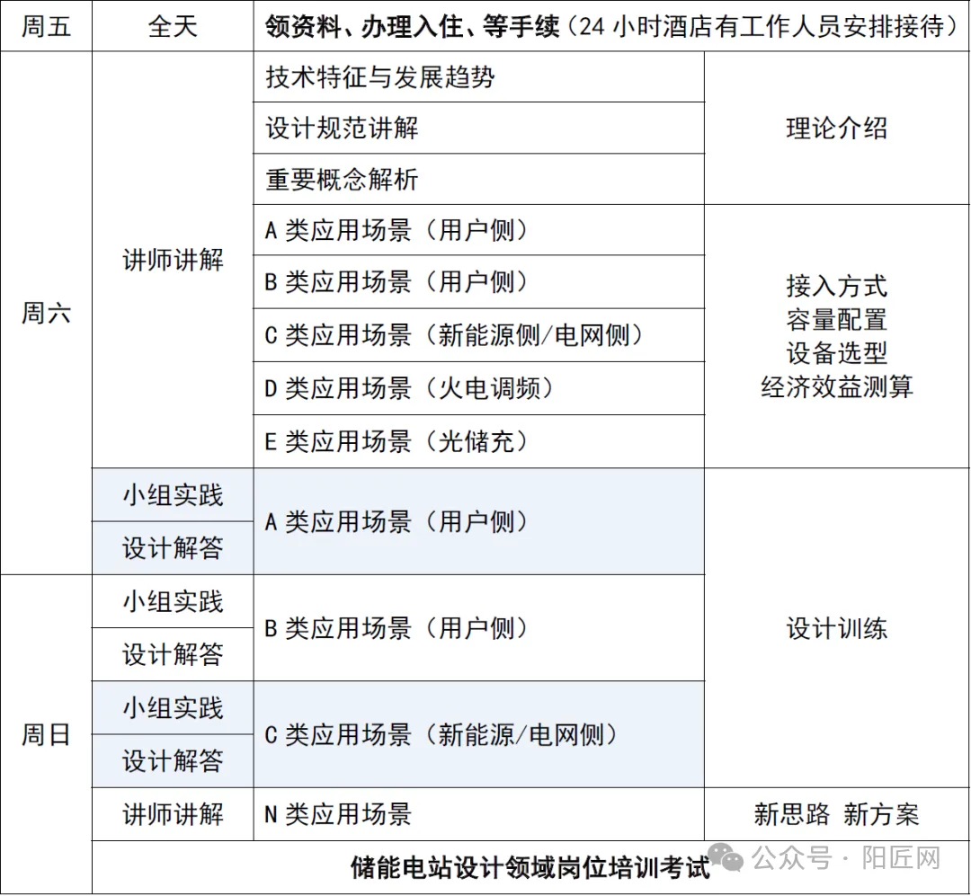 阳匠社区,始创于2007年,持续专注于学习资源库建设,新能源资料库已超十三万份;论坛采用邀请注册制,有7万多注册用户,其中众多用户已成长为新能源企业中坚力量,遍及新能源全产业链,帮助众多用户开启创业征程。4.赠,阳匠学社,《储能电站技术培训讲义》1本/人。;*协助资料收集服务,帮助学员收集相关选题光伏资料上传到论坛,供学员下载。本期培训结束后,经培训考试合格后,学员可自愿申报《个人岗位培训证书》,企业可自愿申报《企业培训证书》《企业荣誉证书》。4200元/人(含会议费、资料)食宿统一安排,费用自理。 地 址:江苏省常州市新北区创意产业园B栋2001室。阳匠学社,始于2007年,以“服务产业·传播新知”为己任,持续专注于学习资源建设,做阳光下的工匠精神践行者,践行“为职场人赋能、为中小企业赋能,让客户更高效地从事垂直行业”使命担当。阳匠学社·培训中心,作为服务于新能源行业的培训机构,致力于开发组编满足行业实务需求的应用型线下培训、企业内训、自编教材、线上课程等,尝试构建适用于全职业生命周期的课程体系,满足从业者终身学习需求。注:阳匠学社·培训中心目前实施的“全国巡讲·每月多期”培训课程,已成为各专业领域标杆课程,学员单位覆盖民企、央企、国企、以及上市公司等大中小微企业,是新能源领域专业人才培训的摇篮。