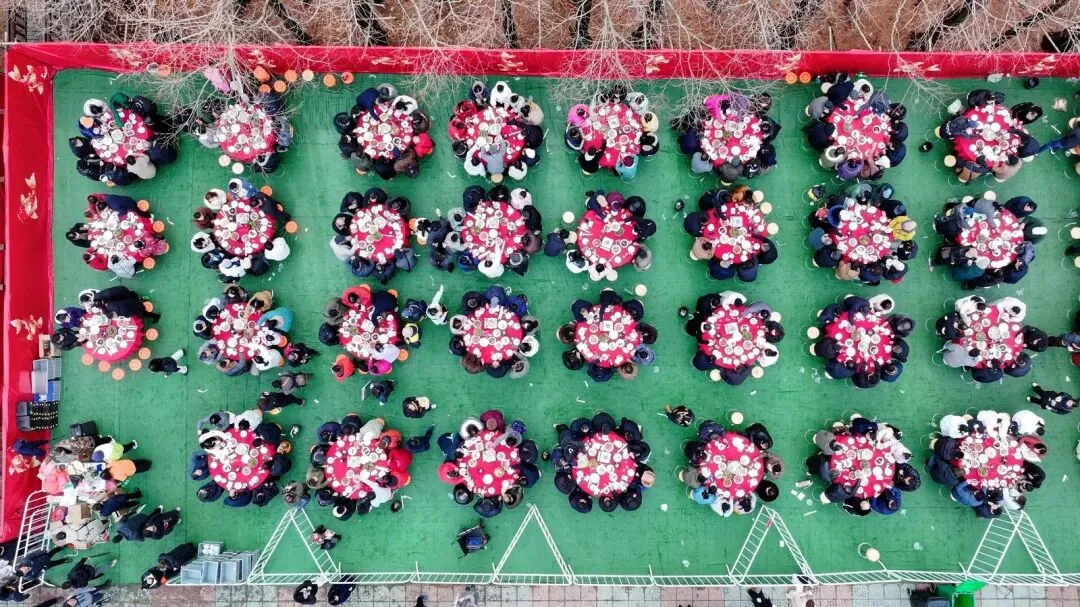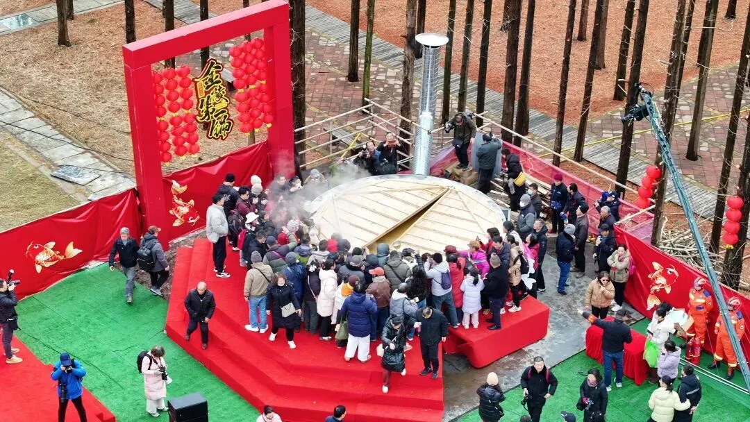 一口直径4.3米的巨型铁锅稳稳立在金牛湖畔,锅下柴火噼啪,锅内奶白色的鱼汤滚滚沸腾,蒸腾出漫天的热气与鲜香。长龙般的队伍从大锅前蜿蜒开来,男女老少手捧汤碗,笑意盈盈。一口热汤下肚,暖意从舌尖蔓延至全身,有人满足地哈出白气,有人迫不及待地吹着热气喝下第二口。