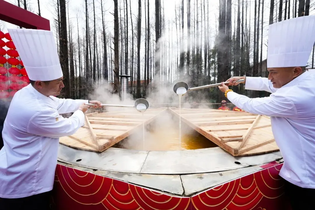 重达5吨的“金陵第一锅”,从清晨便开始由金陵饭店的厨师团队精心熬制。锅内是上千斤金牛湖有机花鲢鱼头,经数小时柴火慢炖,终成这一锅浓白醇厚的极致鲜味。当红绸揭开,热气喷涌而出的那一刻,欢呼声与惊叹声此起彼伏。