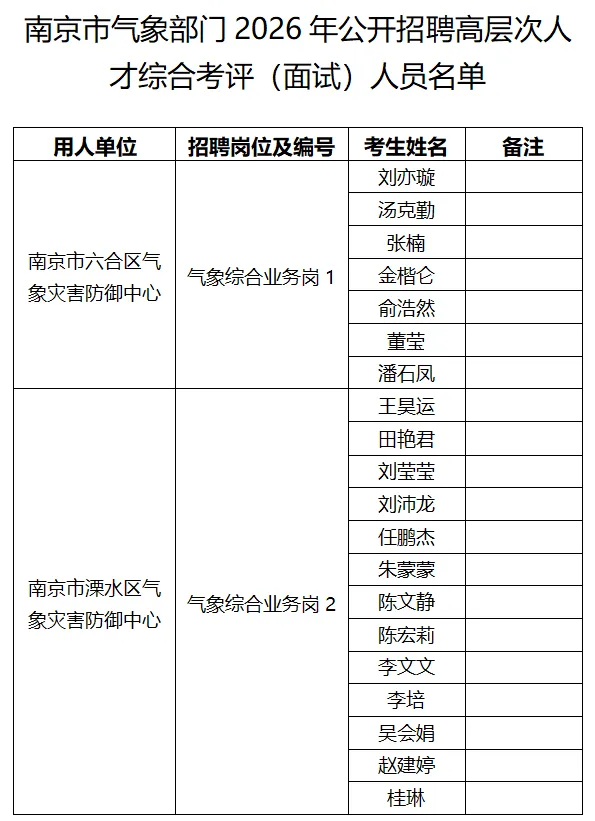 附件:1.南京市气象部门2026年公开招聘高层次人才综合考评(面试)人员名单