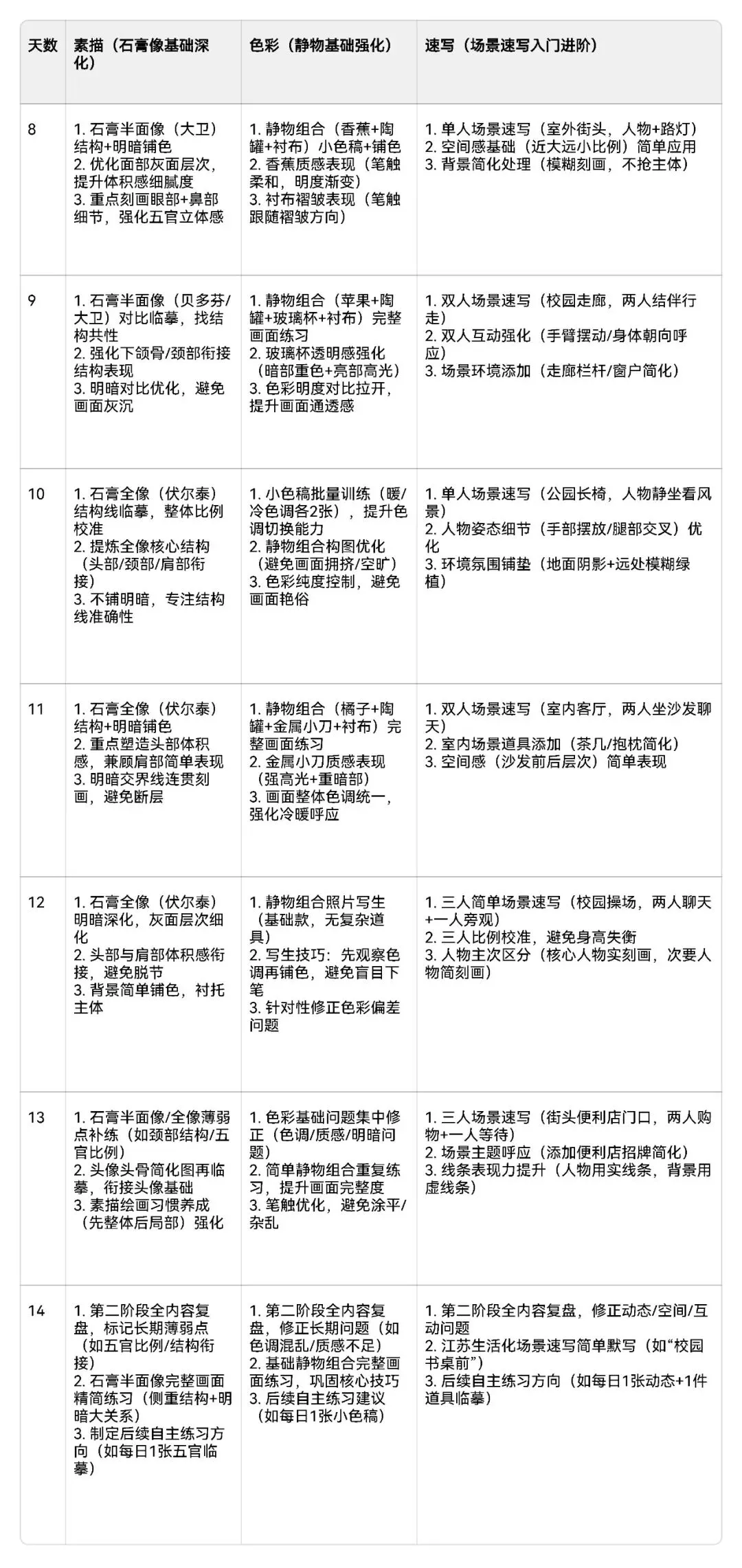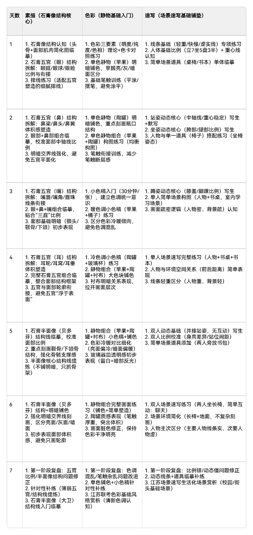 - 中午 12:00 - 14:30:专注力强化时段,进行色彩或速写专项训练。