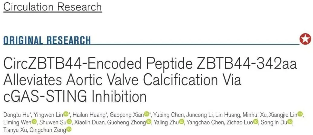 2026年1月30日,南方医科大学南方医院心血管内科曾庆春教授团队在《Circulation Research》发表了题为“CircZBTB44-Encoded Peptide ZBTB44-342aa Alleviates Aortic Valve Calcification Via cGAS-STING Inhibition”的原创性研究论著。本研究揭示了环状RNA circZBTB44可编码多肽ZBTB44-342aa,该多肽通过结合IGF2BP3稳定CAMK1,从而抑制线粒体损伤,减少线粒体DNA向细胞质泄漏,进而阻断cGAS-STING通路持续激活,最终缓解主动脉瓣膜间质细胞的成骨分化与瓣膜钙化,为CAVD的机制研究提供新的理论支持和思路,也为其防治提供了潜在新靶点。