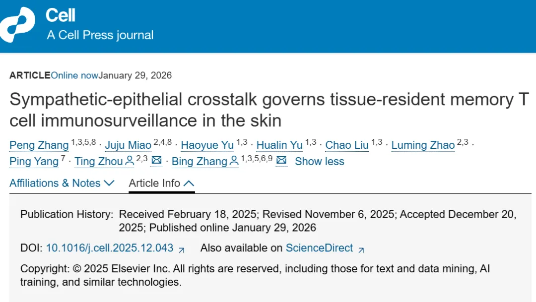 近日,西湖大学张兵/周挺课题组在《细胞》杂志发表题为“Sympathetic-epithelial crosstalk governs tissue-resident memory Tcell immunosurveillance in the skin”的论文,揭示了皮肤组织免疫监视的新机制。皮肤是人体重要的免疫屏障,其中的“组织驻留记忆T细胞”是长期巡逻、抵御病原体和癌变细胞的“哨兵”。本研究首次发现,皮肤中的交感神经纤维可以通过释放去甲肾上腺素,作用于表皮角质形成细胞上的特定受体,进而抑制细胞分泌一种名为CXCL16的关键趋化因子。CXCL16的主要作用是“招募”血液循环中的T细胞进入皮肤组织,并使其转化为长期驻留的“哨兵”细胞。当这一信号被抑制时,新“哨兵”的补充减少,导致皮肤局部的免疫监视能力下降。动物实验证实,在黑色素瘤模型中,抑制交感神经活性可以显著增强皮肤中这类T细胞的丰度与抗肿瘤效果,使无瘤生存的小鼠比例大幅提高。该调控机制同样存在于鼻腔、气道等其他屏障组织。该研究为理解压力影响免疫系统提供了新的科学解释,提示交感神经过度激活(如长期处于应激状态)可能不利于机体的免疫防御。这一发现也为未来探索通过调节特定神经通路来增强疫苗效果或治疗自身免疫性疾病,提供了新的潜在思路。(信源:“奇点网”微信公众号)