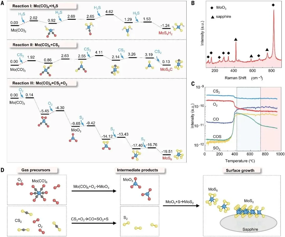 在此研究中,作者聚焦于反应动力学在提升畴尺寸、生长速率及薄膜质量方面的作用。通过阐明限制高质量MoS2生长的基本动力学瓶颈,引入了一种新型技术——氧辅助MOCVD(oxy-MOCVD)来突破这些限制。通过精确引入氧气与六羰基钼[Mo(CO)6]和二硫化碳(CS2)预反应,生成了高纯度三氧化钼(MoO3)和硫作为反应中间体。这些中间体促使蓝宝石衬底上生长出单向排列的二硫化钼(MoS2)畴,其畴尺寸更大(数百微米级),生长速率较传统MOCVD提升两个数量级以上,同时保持晶圆级均匀性。