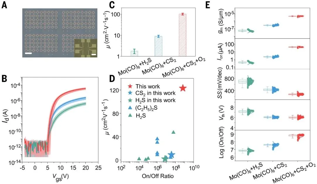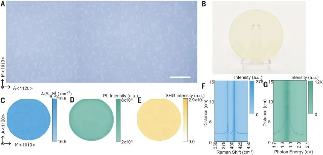 所得MoS2薄膜无碳杂质污染,室温载流子迁移率最高达122.9 cm2 V−1 s−1,平均值为101.3 cm2 V−1 s−1,与报道最优CVD生长薄膜性能相当。进一步,通过合成均匀的150毫米单晶MoS2晶圆,验证了氧辅助MOCVD技术的可扩展性。该技术通过精准调控反应动力学,弥合了实验室级CVD质量与工业级MOCVD可扩展性之间的差距。