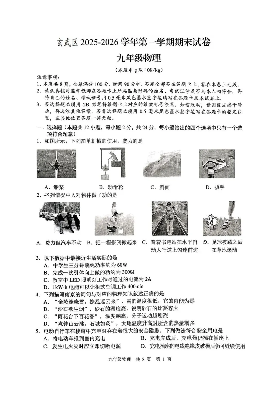 本卷全面覆盖力学、热学、电学、能量转化等课标核心内容,基础题如简单机械判断、功的概念辨析是主要得分点;难点集中在综合应用题,如第12题需分析涡轮喷气发动机能量转化效率,第28题要求运用压力传感器设计电子秤电路,对学生的科学探究与工程思维素养提出较高挑战。