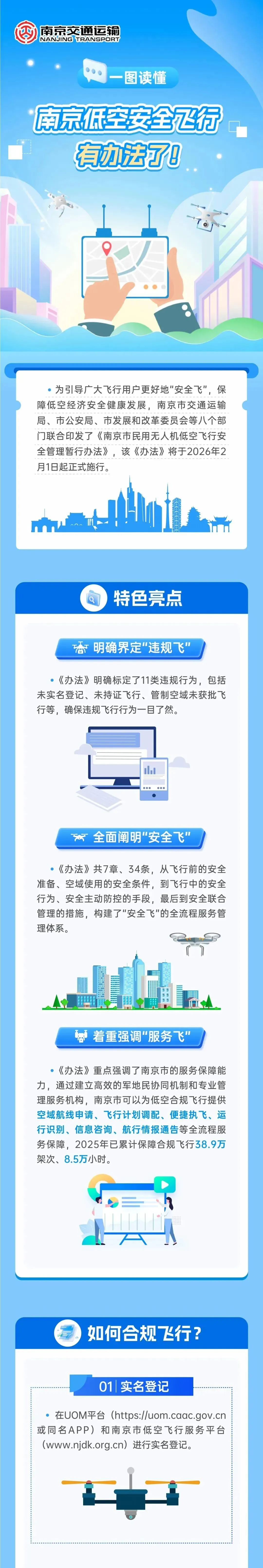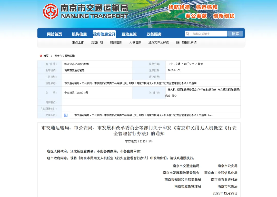 《南京市民用无人机低空飞行安全管理暂行办法》将于2026年2月1日起正式施行,有效期至2028年1月31日。