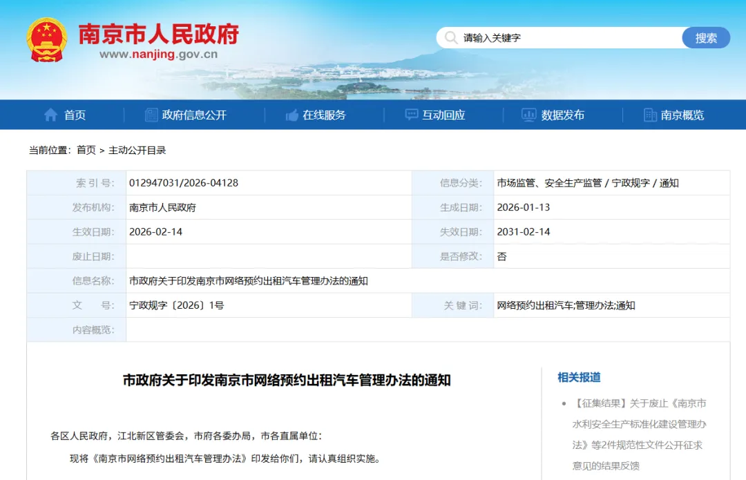 《南京市网络预约出租汽车管理办法》自2026年2月14日起施行,有效期至2031年2月13日。