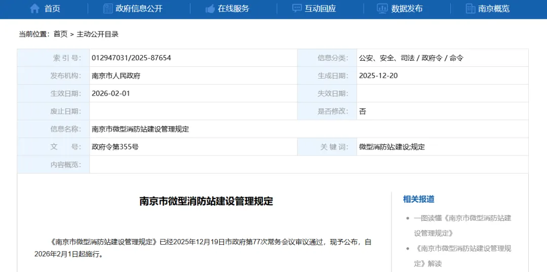 《南京市微型消防站建设管理规定》将于2026年2月1日起正式施行。
