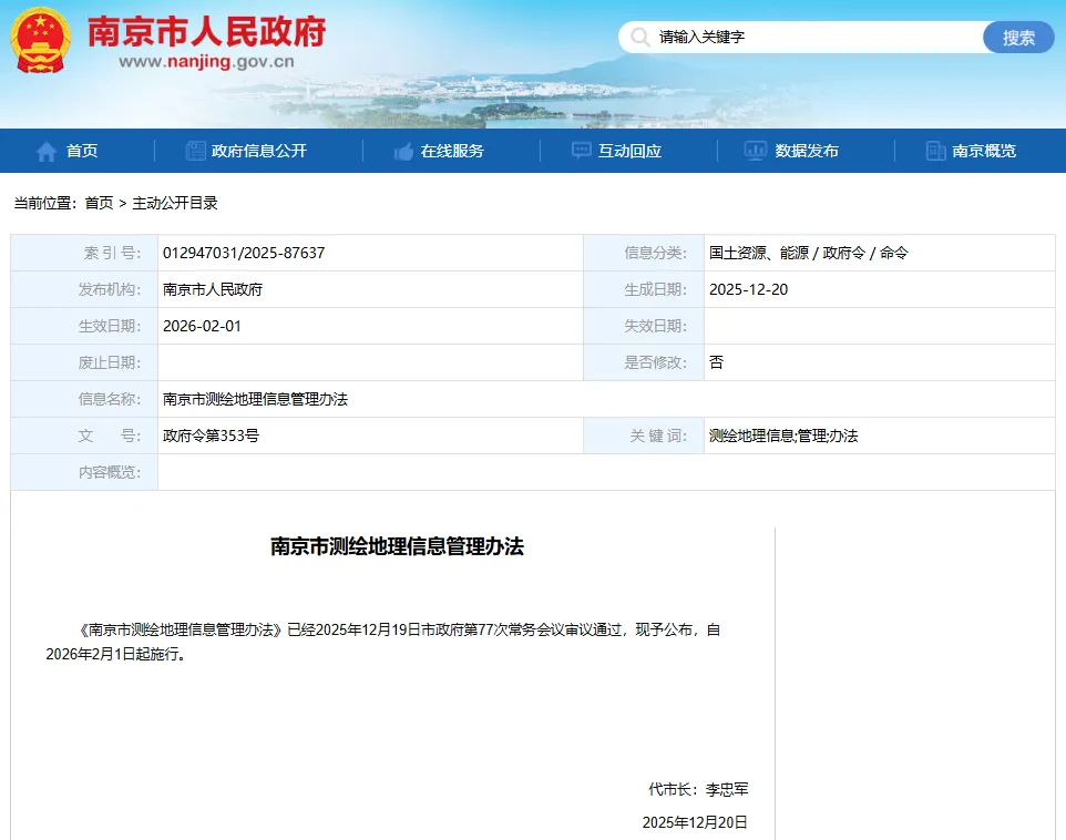 为了加强测绘地理信息管理,促进测绘地理信息事业发展,保障测绘地理信息事业为经济建设、国防建设、社会发展和生态保护服务,维护地理信息安全,市政府修订了《南京市测绘地理信息管理办法》,自2026年2月1日起正式施行。