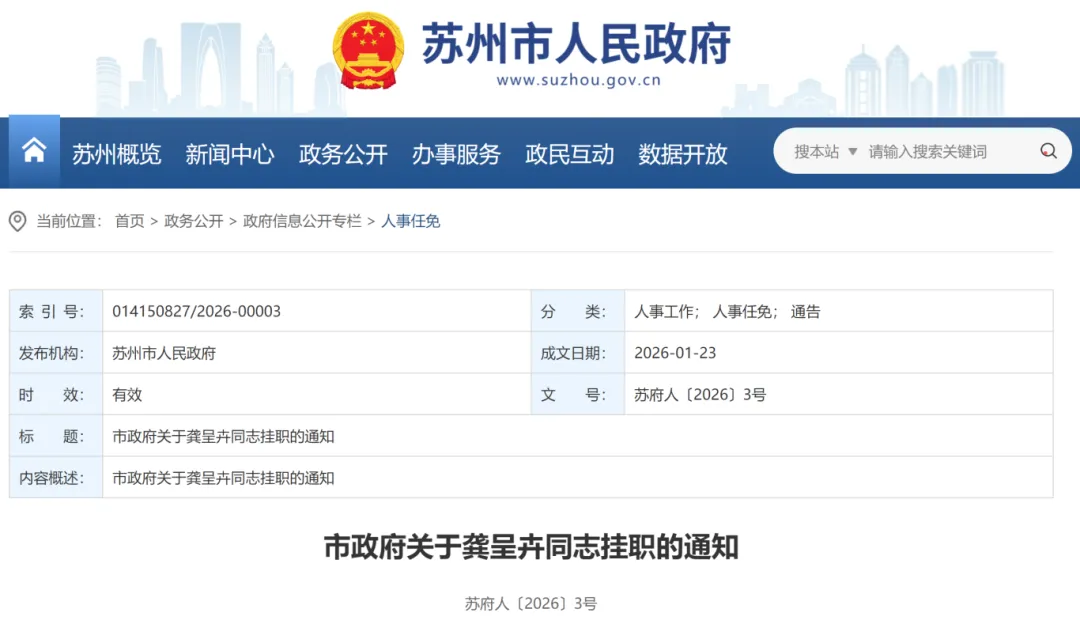 近日,苏州市政府网站公布一批人事调整,具体如下: