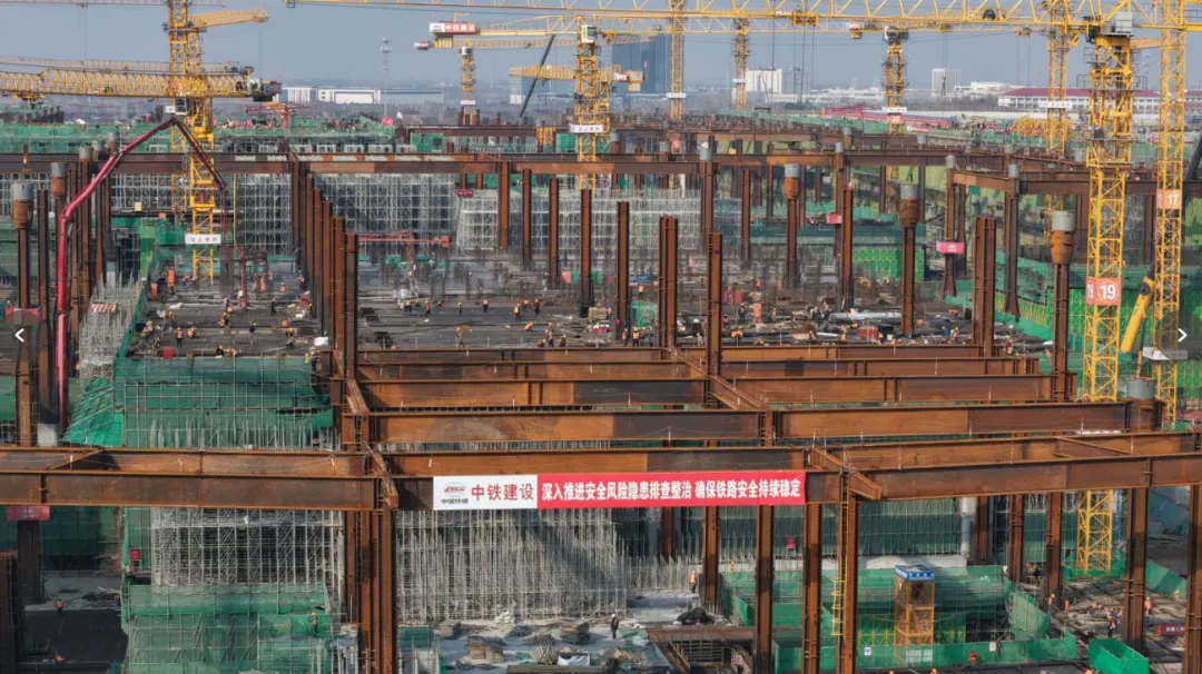 截至目前,南京北站北广场结构工程完成100%,南广场结构工程完成70%,站房工程基础施工完成95%(剩余占用结构作业面道路部分正在收尾施工),出站层结构施工完成60%,承轨层结构完成40%,高架层结构施工完成20%,钢结构已安装5.8万吨,占比50%。