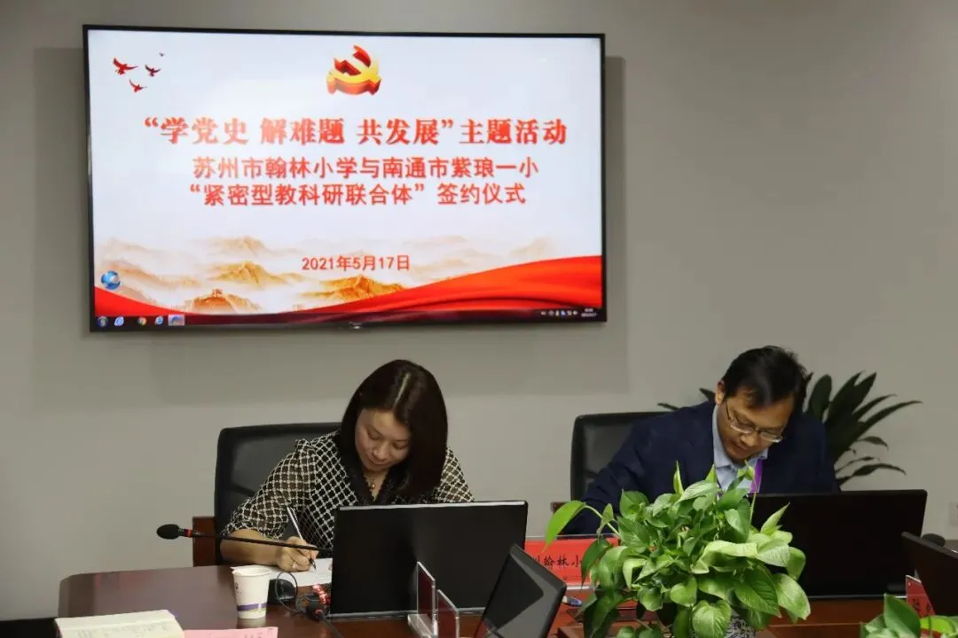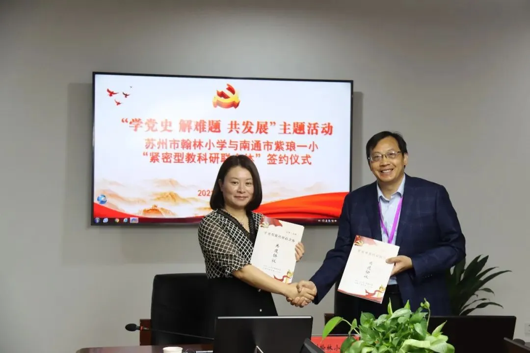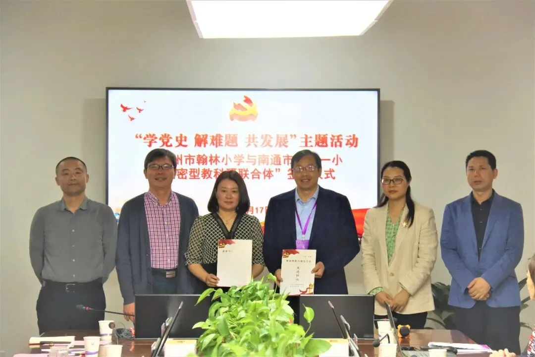学党史,解难题,共发展。为进一步推进党史学习教育和高质量办学,5月17日,苏州市翰林小学和南通市紫琅第一小学签署共建协议,缔结为跨区域“紧密型教科研联合体”。翰林小学校长王晓琳,副校长胡修喜、郭建芬等一行12人,在紫琅一小参加签约仪式暨首次共建活动。