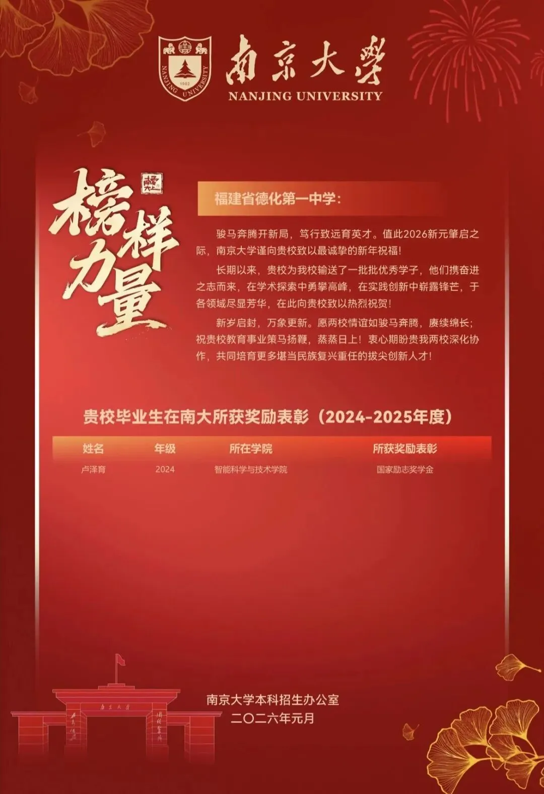 >南京高校向德化一中发来喜报
