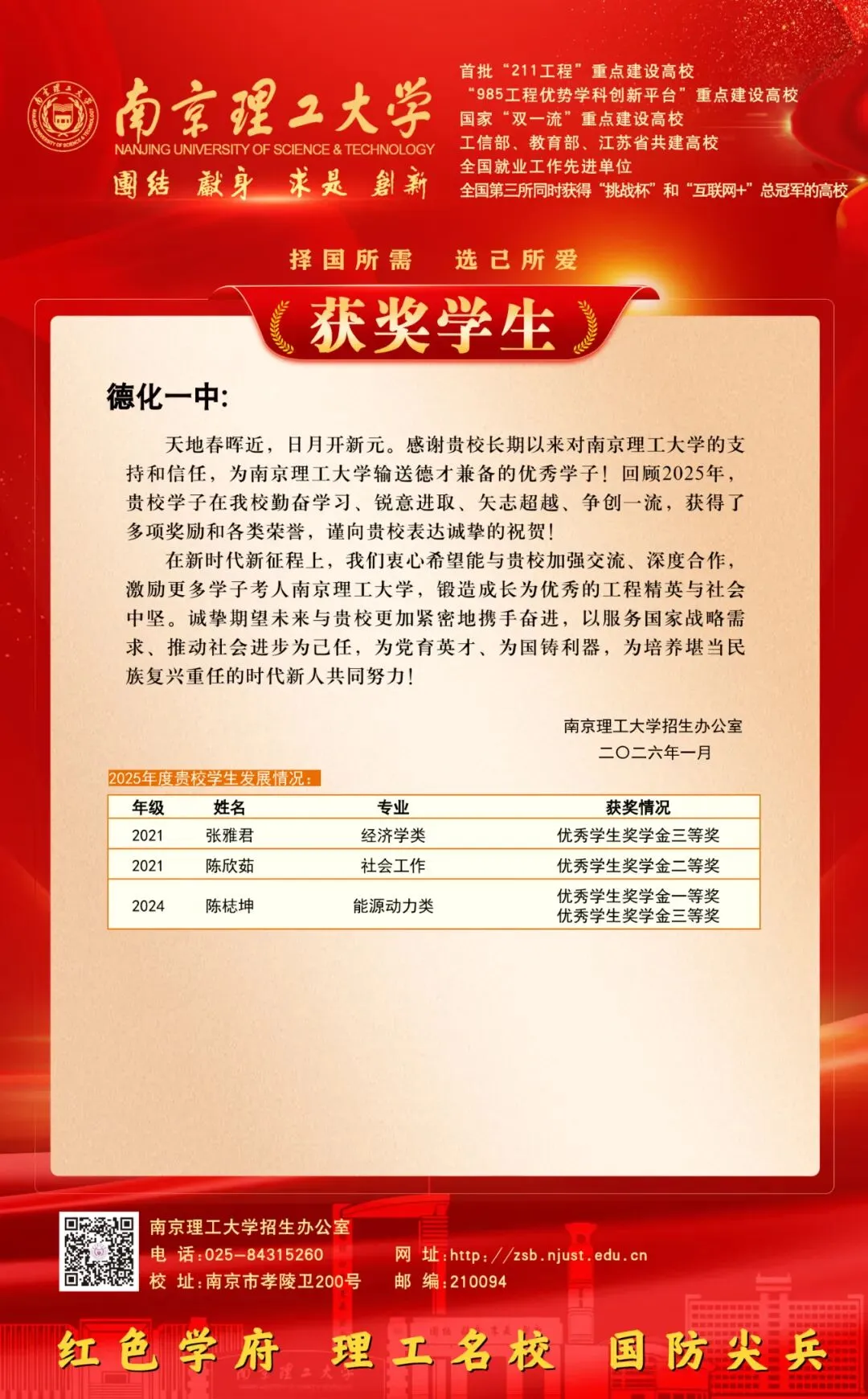 南京高校向德化一中发来喜报