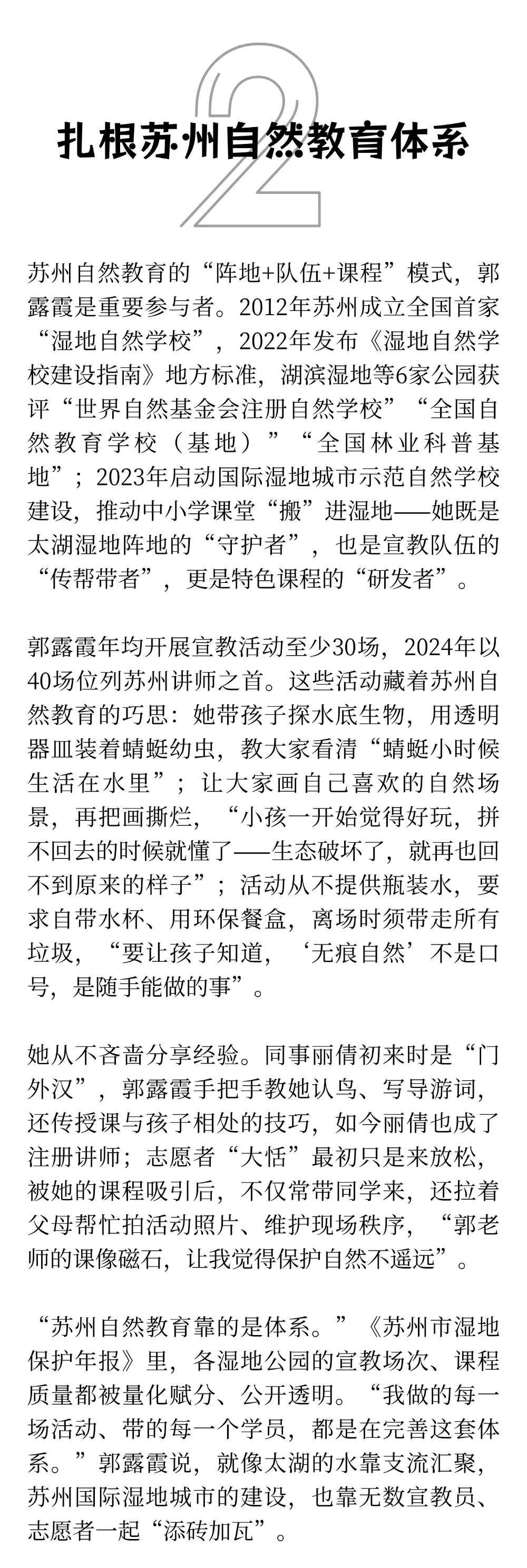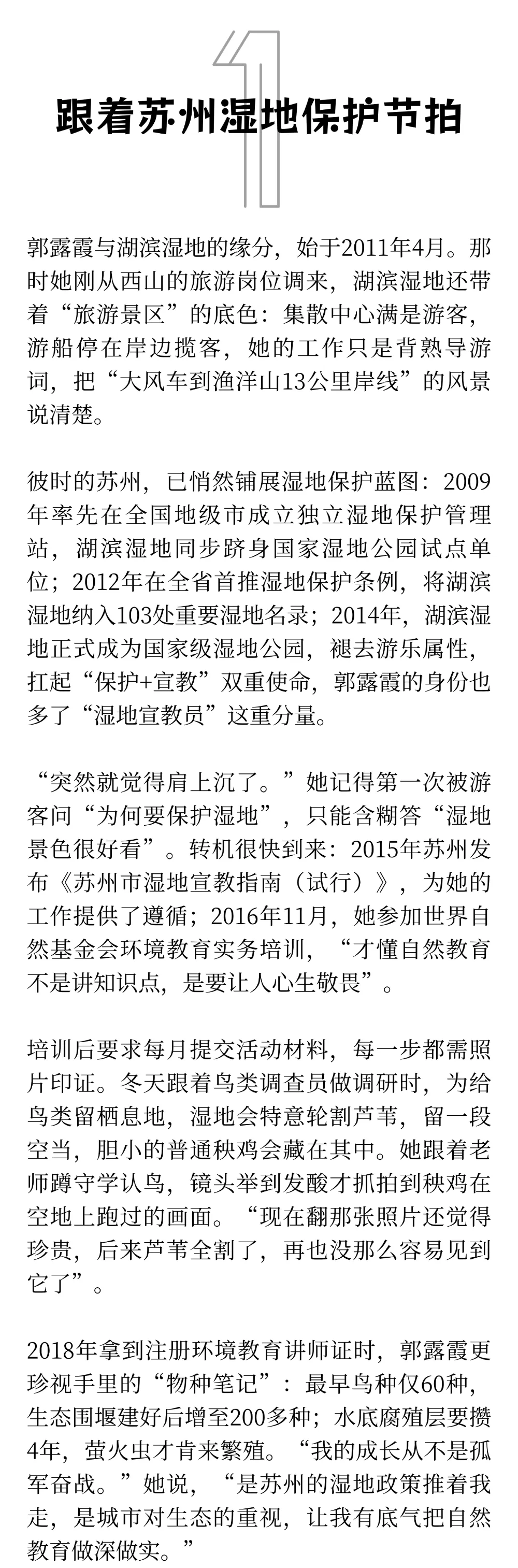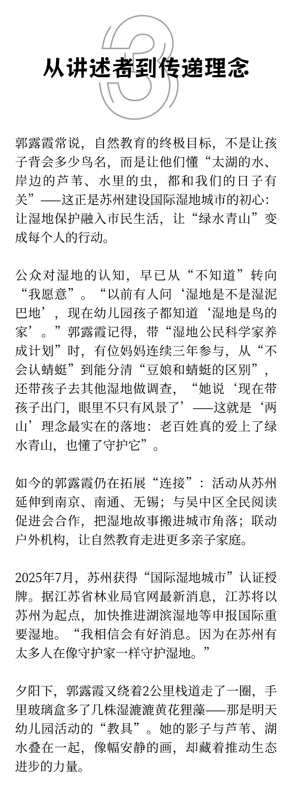 清晨的苏州太湖湖滨国家湿地公园,芦苇叶尖凝着露水,郭露霞已踩着木栈道往里走。帆布包里的透明密封盒里,躺着刚捡的蜻蜓蜕壳与蝉蜕——这些都是她下午社区社团课的“教具”。从2011年成为这里的讲解员,到如今的世界自然基金会优秀注册讲师,13年来,她的每一步都踩着苏州建设国际湿地城市的节拍,每一堂课都是“两山”理念在基层最鲜活的实践。