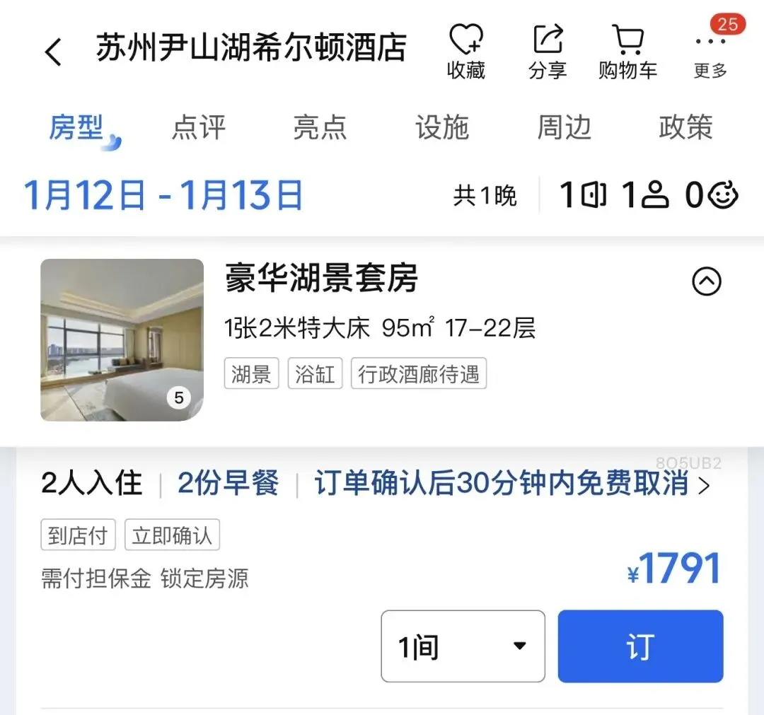 另外一点是,尹山湖希尔顿常年¥500+的基础房价在苏州市场也显示出了较佳的性价比。