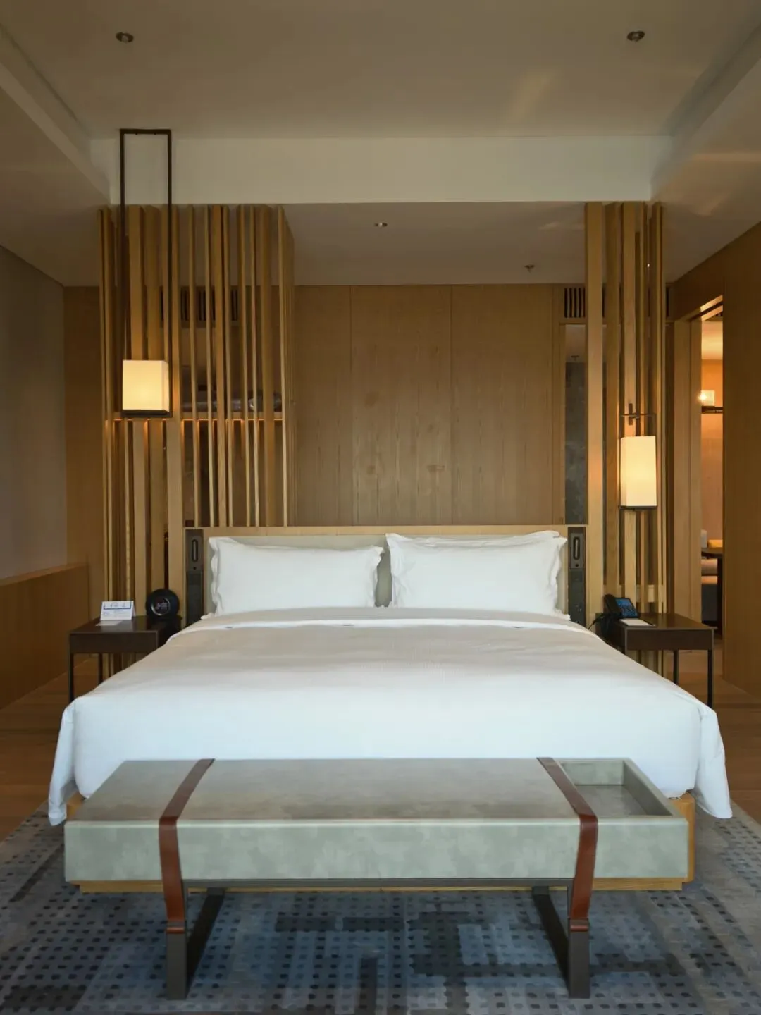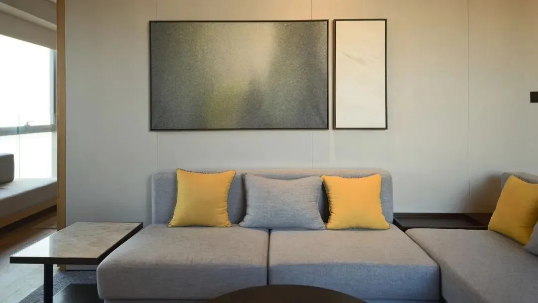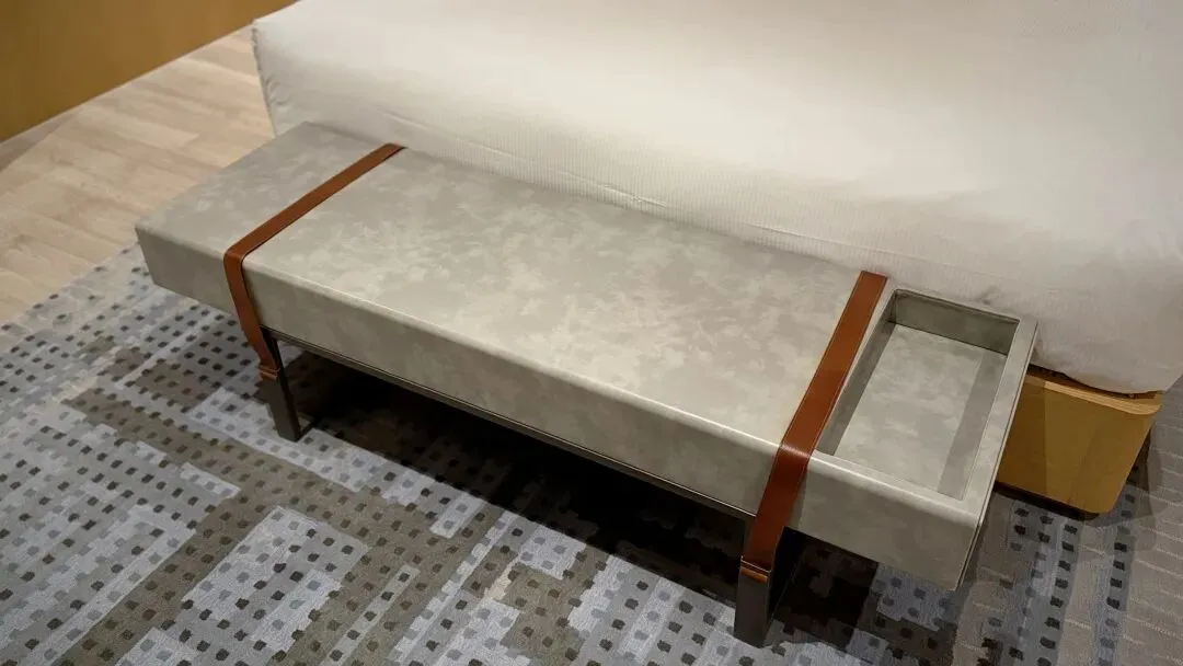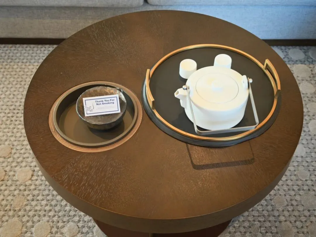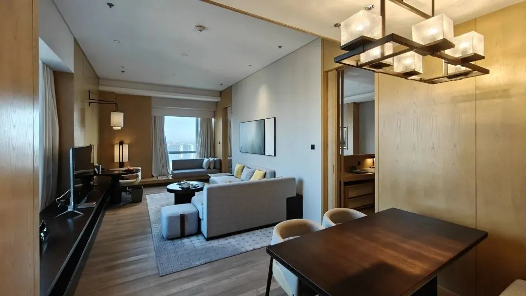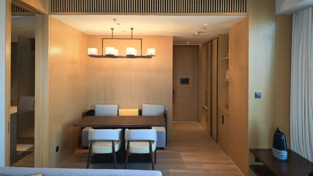 套房布局上是酒店套房常见的两开间布局,其中一开间是进门客卫+客厅会客区,另一开间是主卫+卧室。