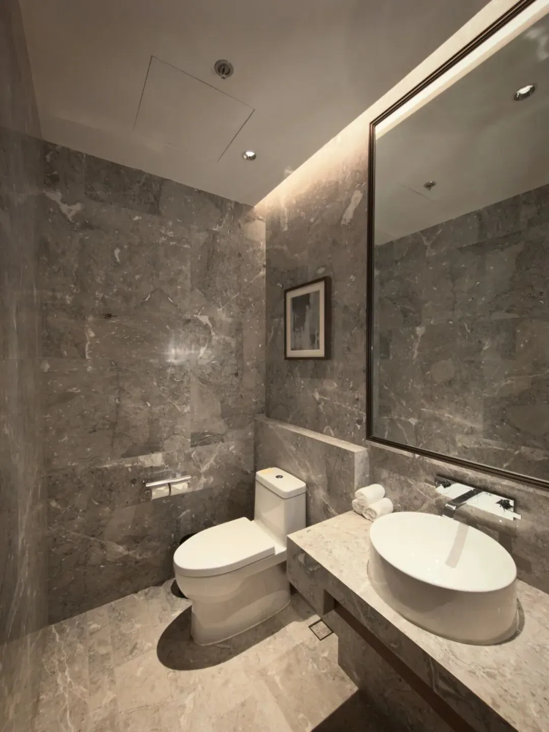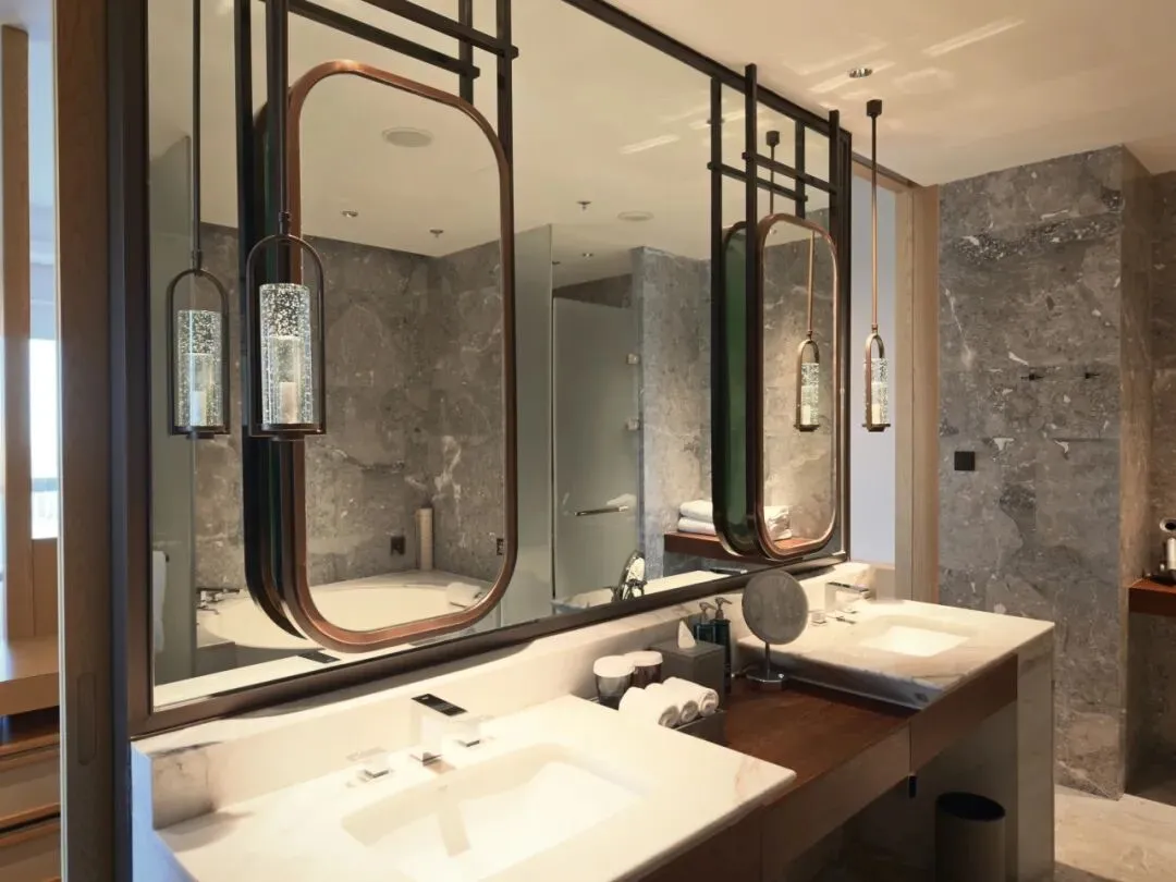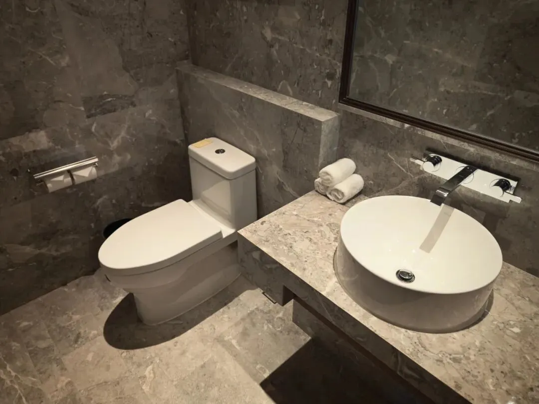 客卫墙面桌台也覆以奢石。不过并未采用智能马桶。