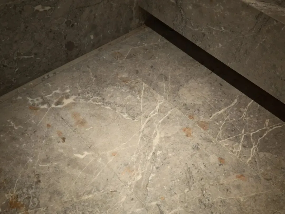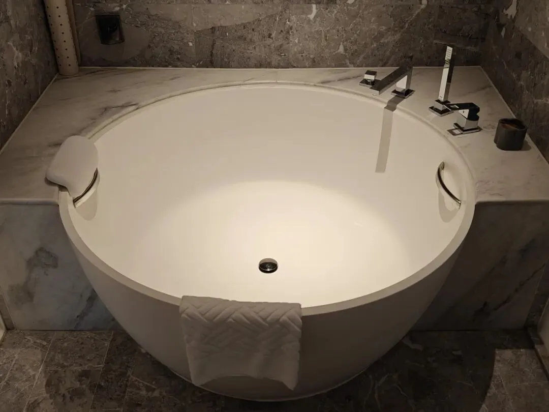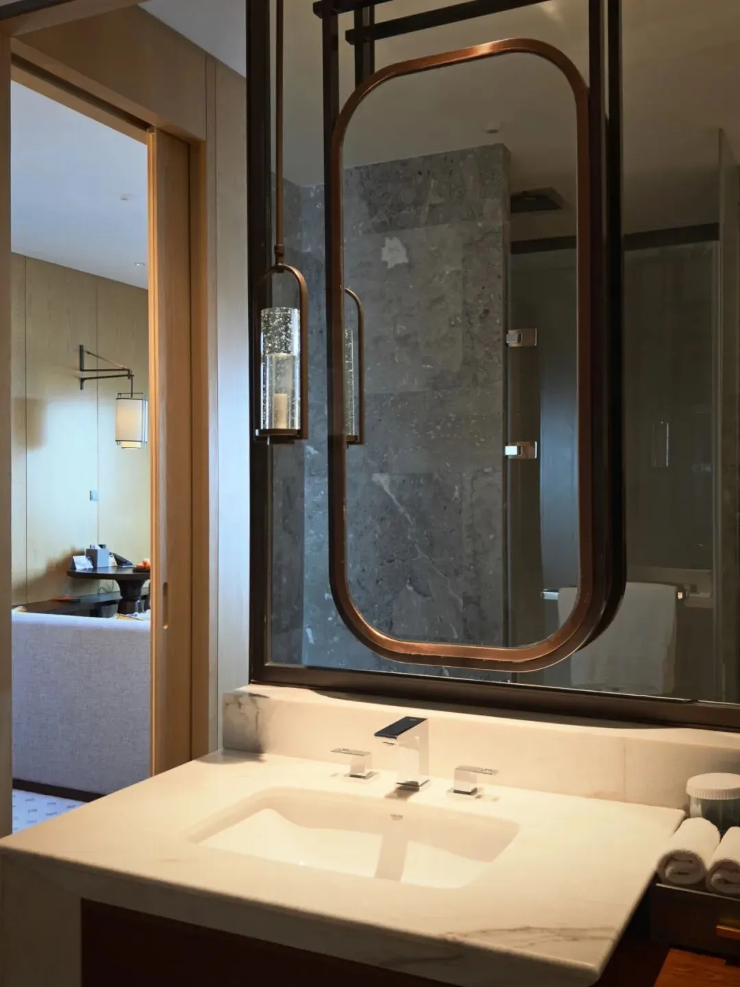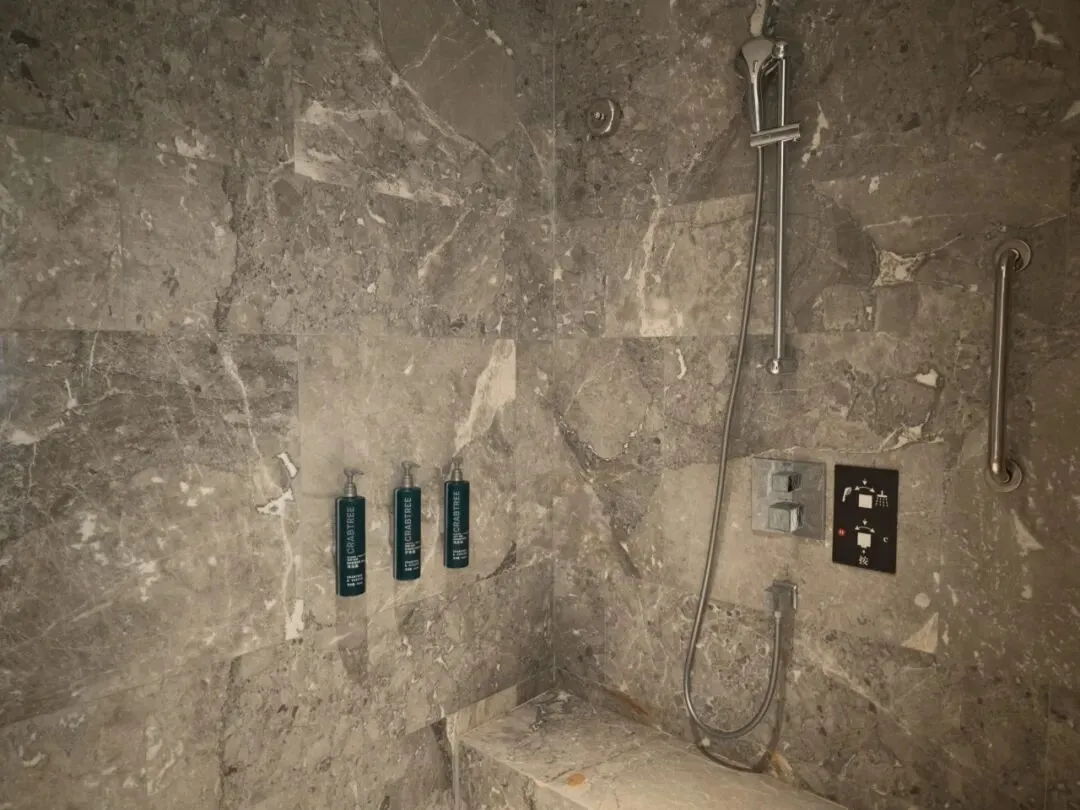 客卫墙面桌台也覆以奢石。不过并未采用智能马桶。