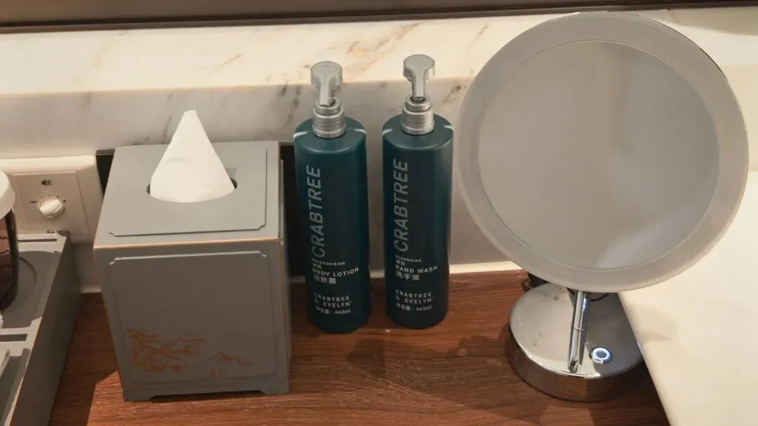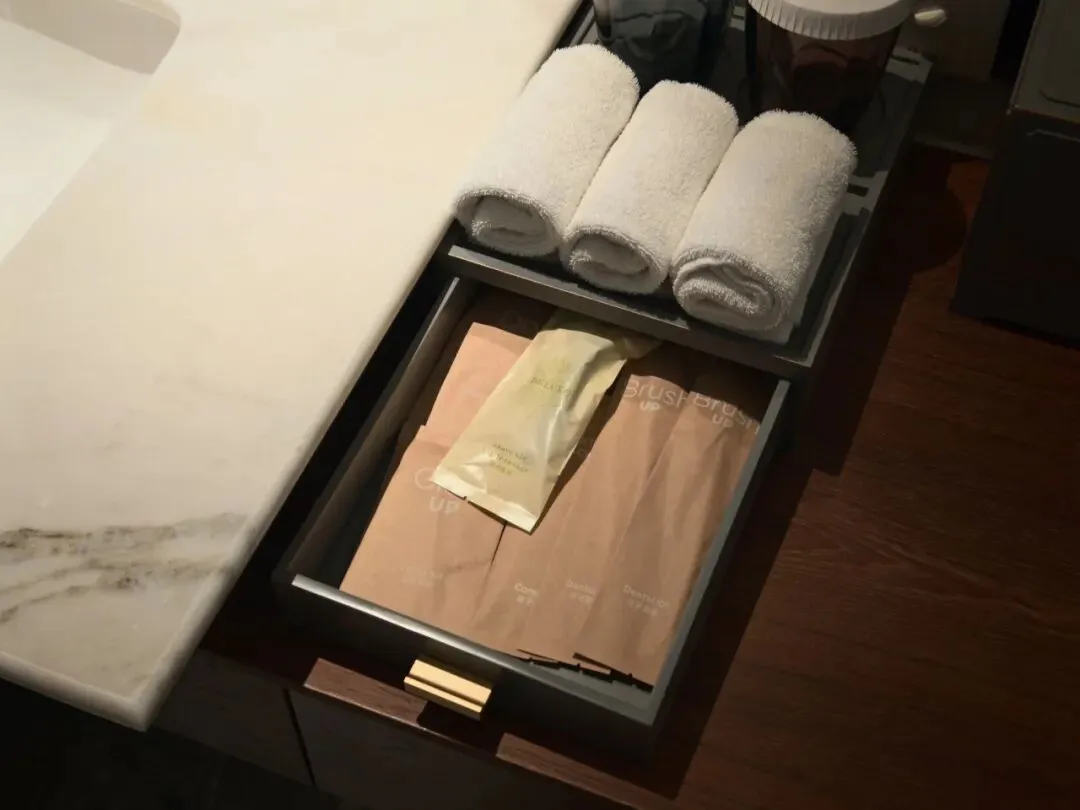 双台盆,备品为希尔顿常规,牛皮纸包装的备品体验一般。