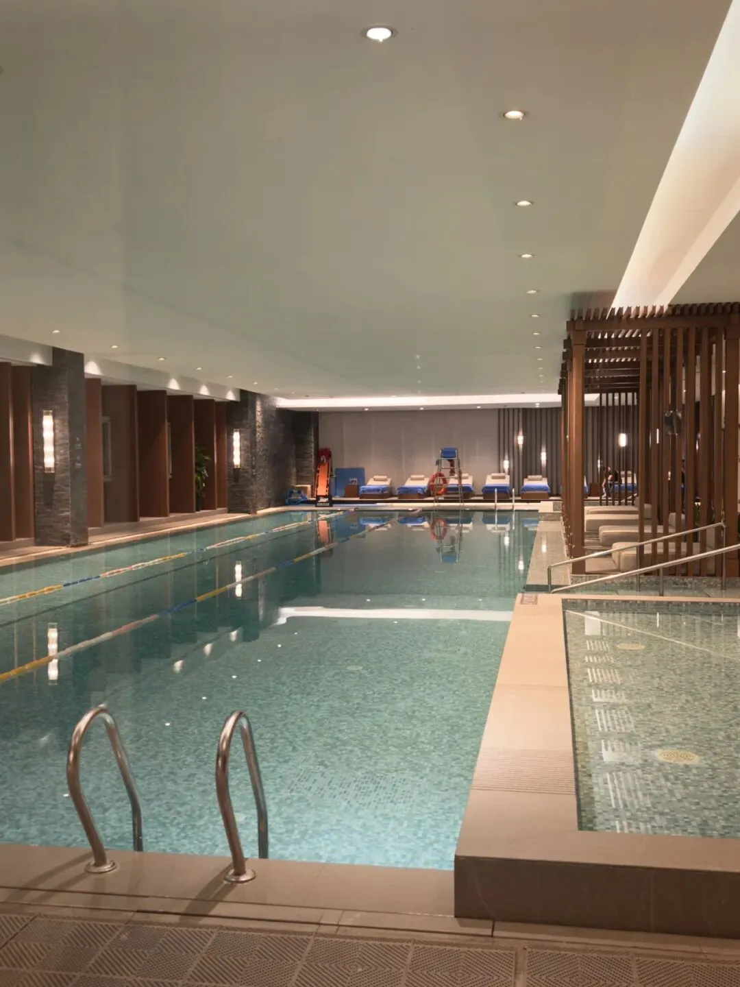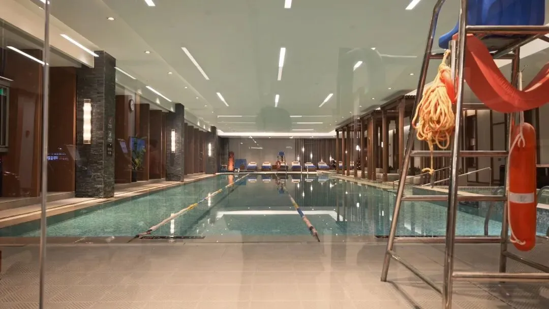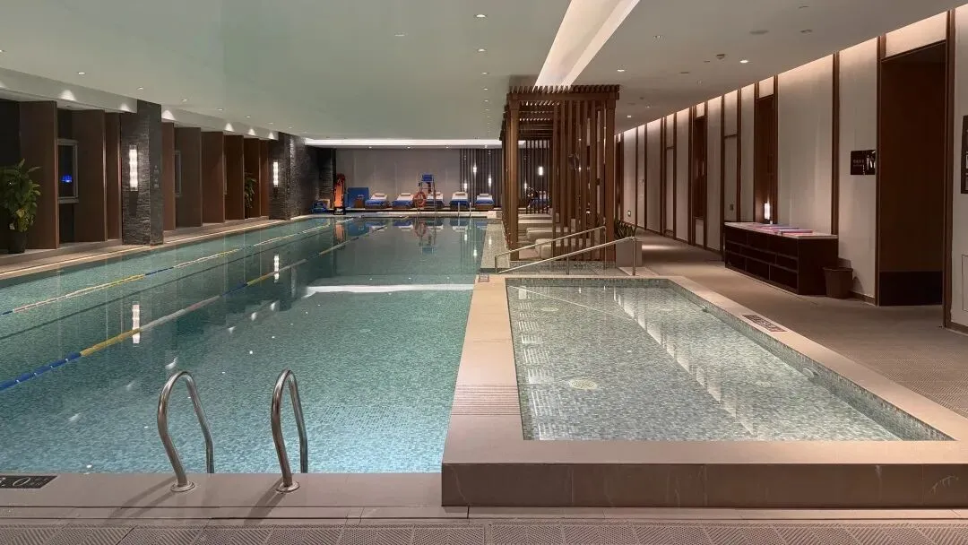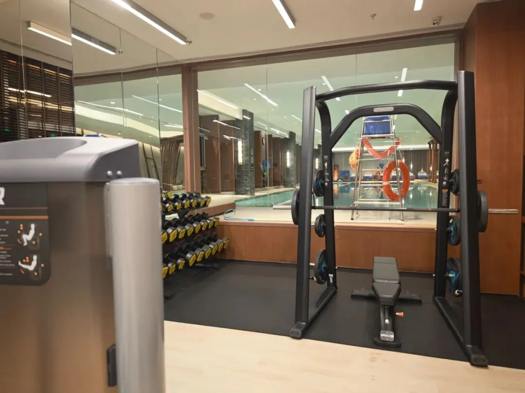 健身房泳池在同一个入口,健身器械选用Precor,数量也够用。泳池光影很出片。