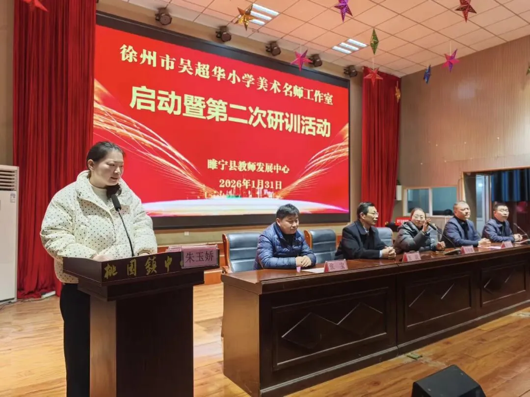 为加大小学美术骨干教师培养力度,探索人工智能时代美育提质增效的创新路径,充分发挥名师工作室的专业引领与辐射作用,徐州市吴超华小学美术名师工作室启动暨集中研训活动于2026年1月31日在桃园镇中心小学顺利举行。参加本次活动的领导、教师有睢宁县教师发展中心领导,桃园镇中心小学领导、吴超华小学美术名师工作室全体成(学)员、桃园镇中心小学艺体名师工作室学员和县、镇部分非美术学科青年教师计60余人。